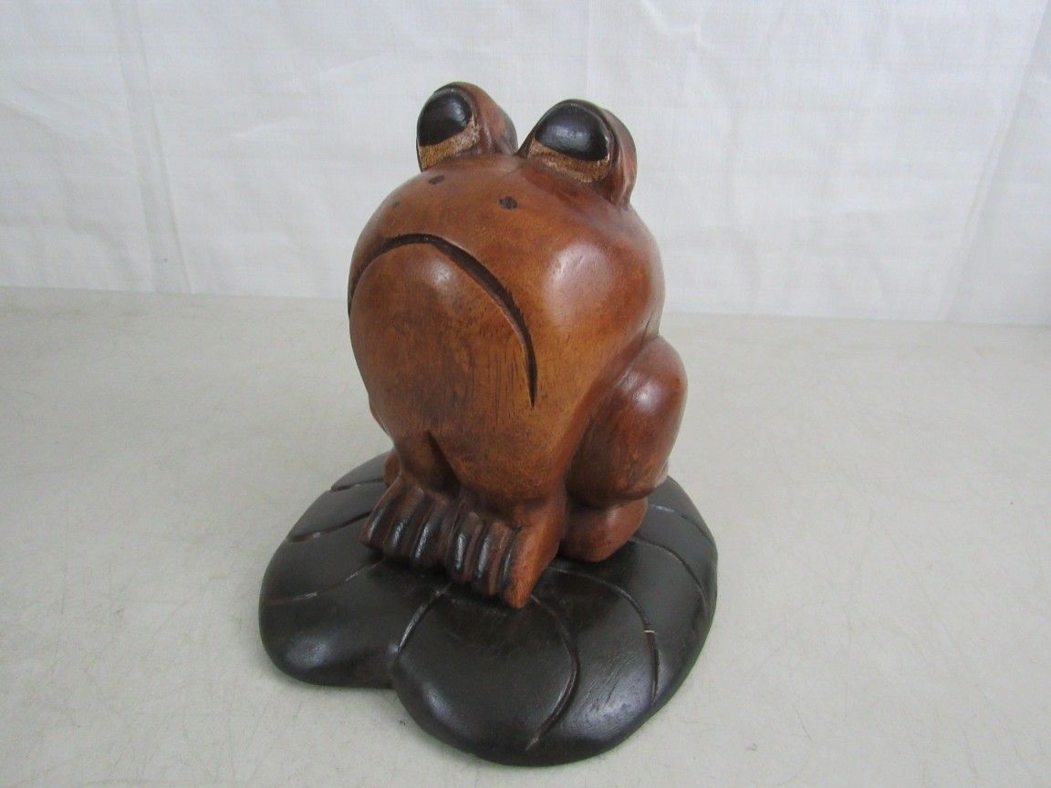 The frog is 8" height X 7 3/4" length X 7 1/2" width. Made of a hard wood and weighs 2 pounds 8 ounces. Good condition with some minor age and usage wear. No broken or missing parts. See photo's