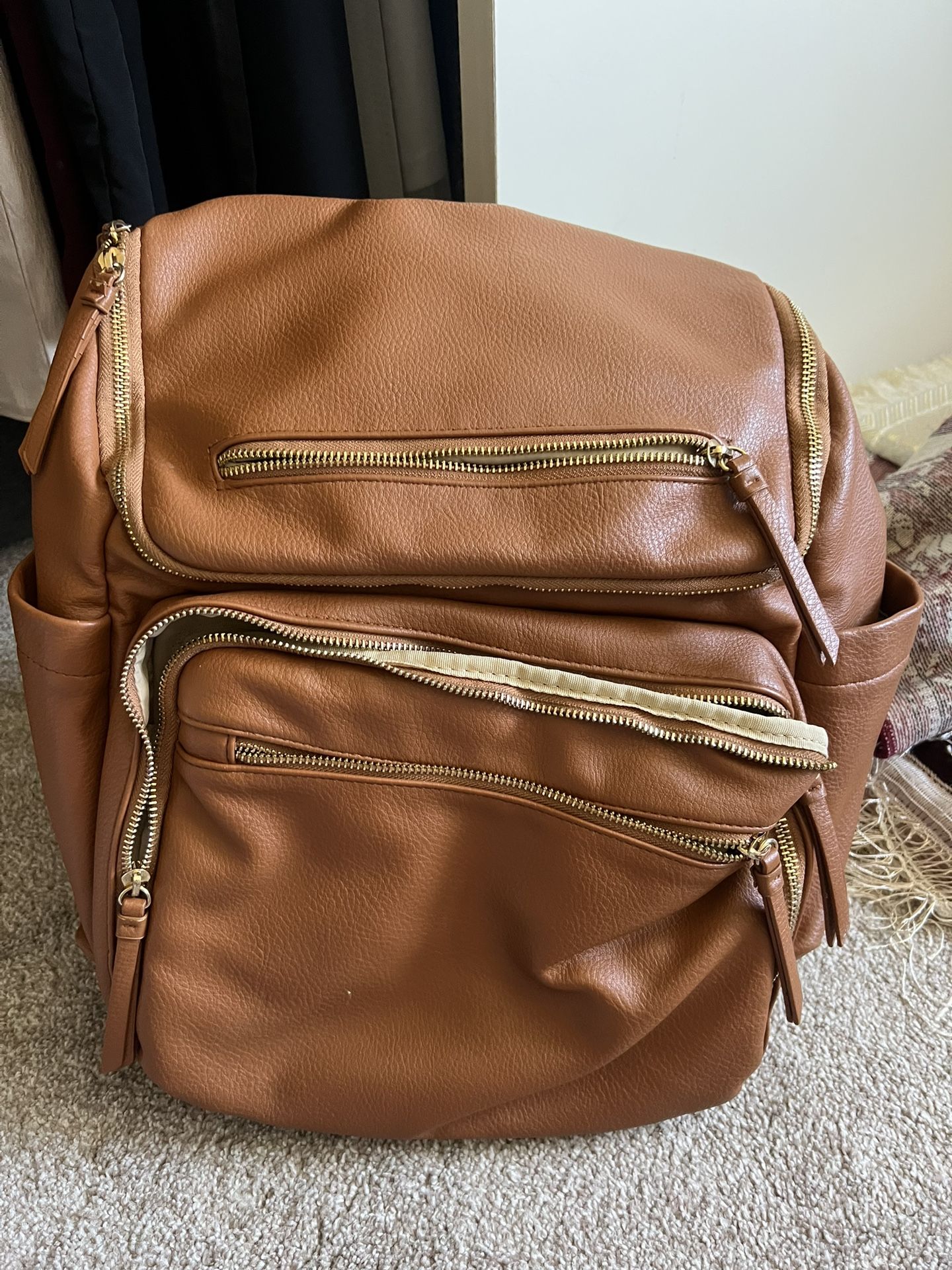 $30— Faux leather brown diaper backpack bag well loved. Has insulated bottle holders and stroller strap. $25— black backpack breast bump carrier bag or diaper bag. Has many pockets and storage. Can fit spectra pump or medela pump inside. No longer need either would love for another family to benefit from