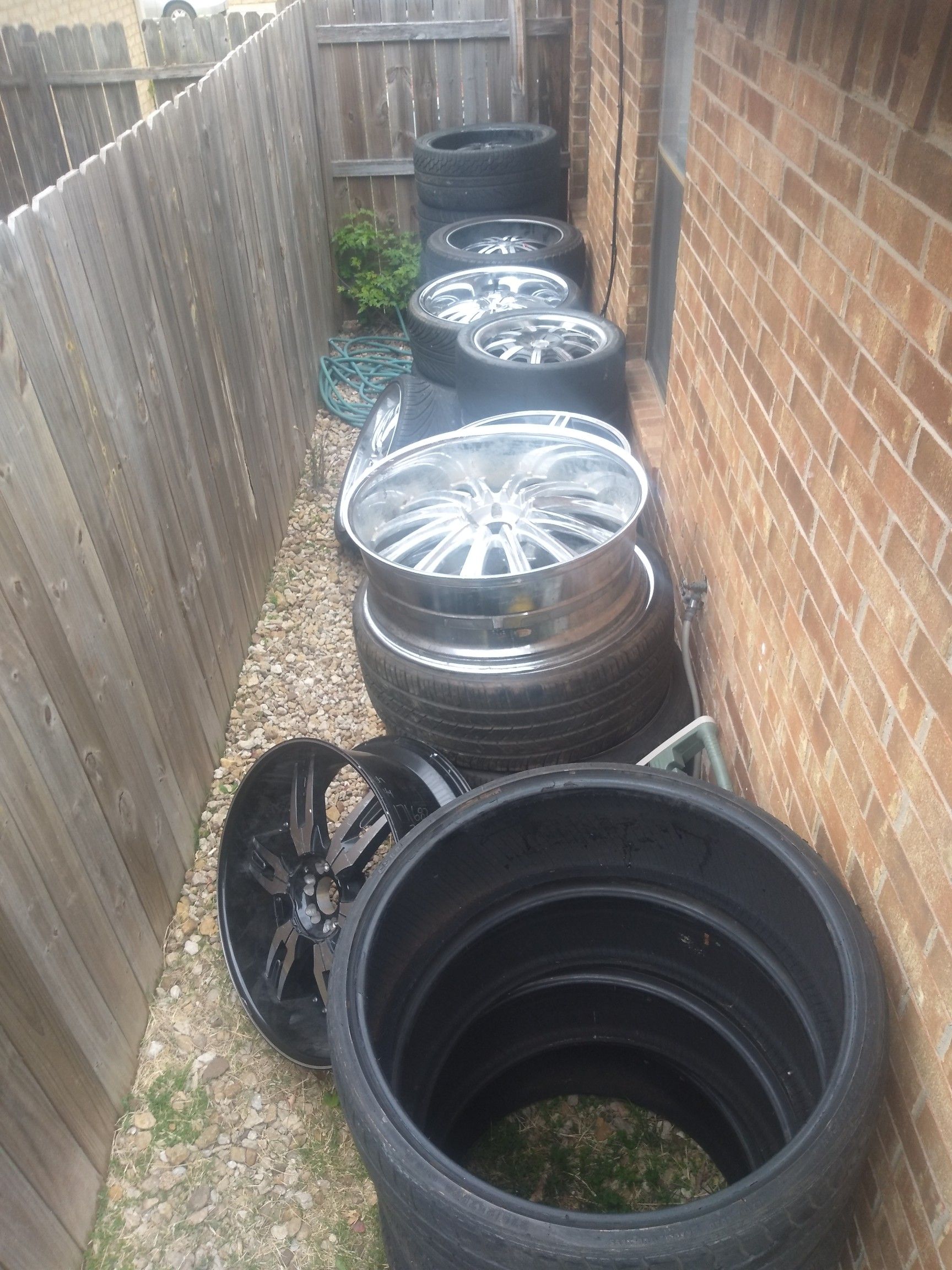 What I have up for sale are 6 set's of rims from 18",22",24,28 1st 2 pics are a set of 28" 5lugs Pics 3-4 are set of chrome and black 18" 4 lugs they all will need new tires Pics 5-6 are a set of chrome 24" 5 lugs Pics 7-8 are a set of chrome and black 22" 6 lugs Pics 9-10 are a set of black paint peeling of 24" 6 lugs Pic 11 is just 1 chrome rims 24" 5 lugs Make me and offer on any set