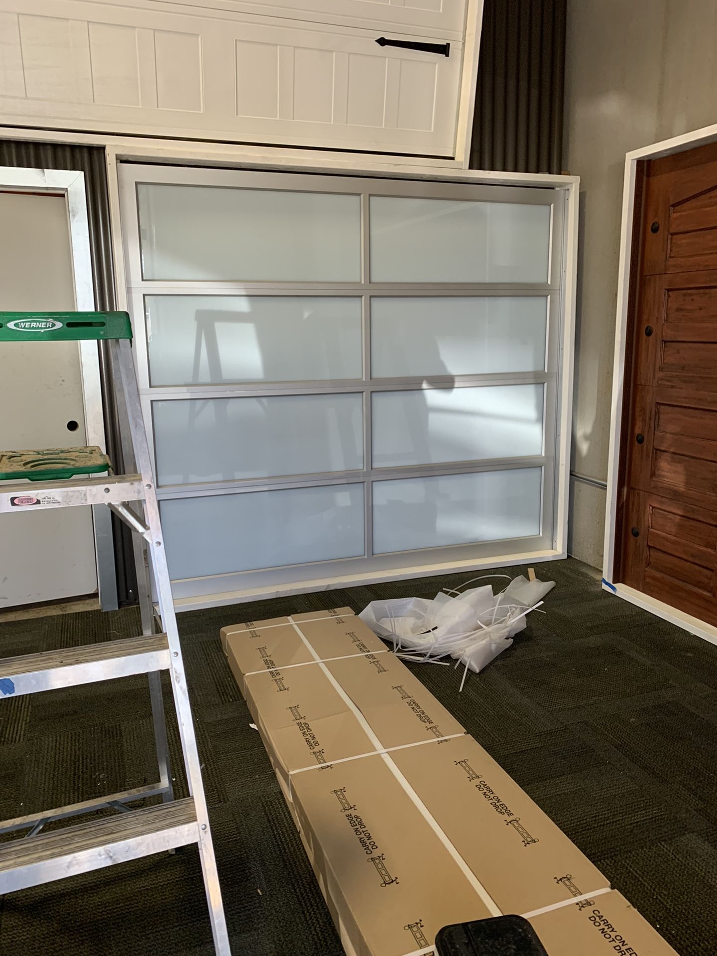 Full View Modern Garage Door NEVER USED…New in box. $1650 includes panels, new track, hardware, springs, tube etc…Retails for over $5500. Have other units different sizes and finishes….prices are quite a bit higher. This is a single car garage door 8’x7’ size. No….WE DO NOT INSTALL, however we can refer independent installer for you Thanks