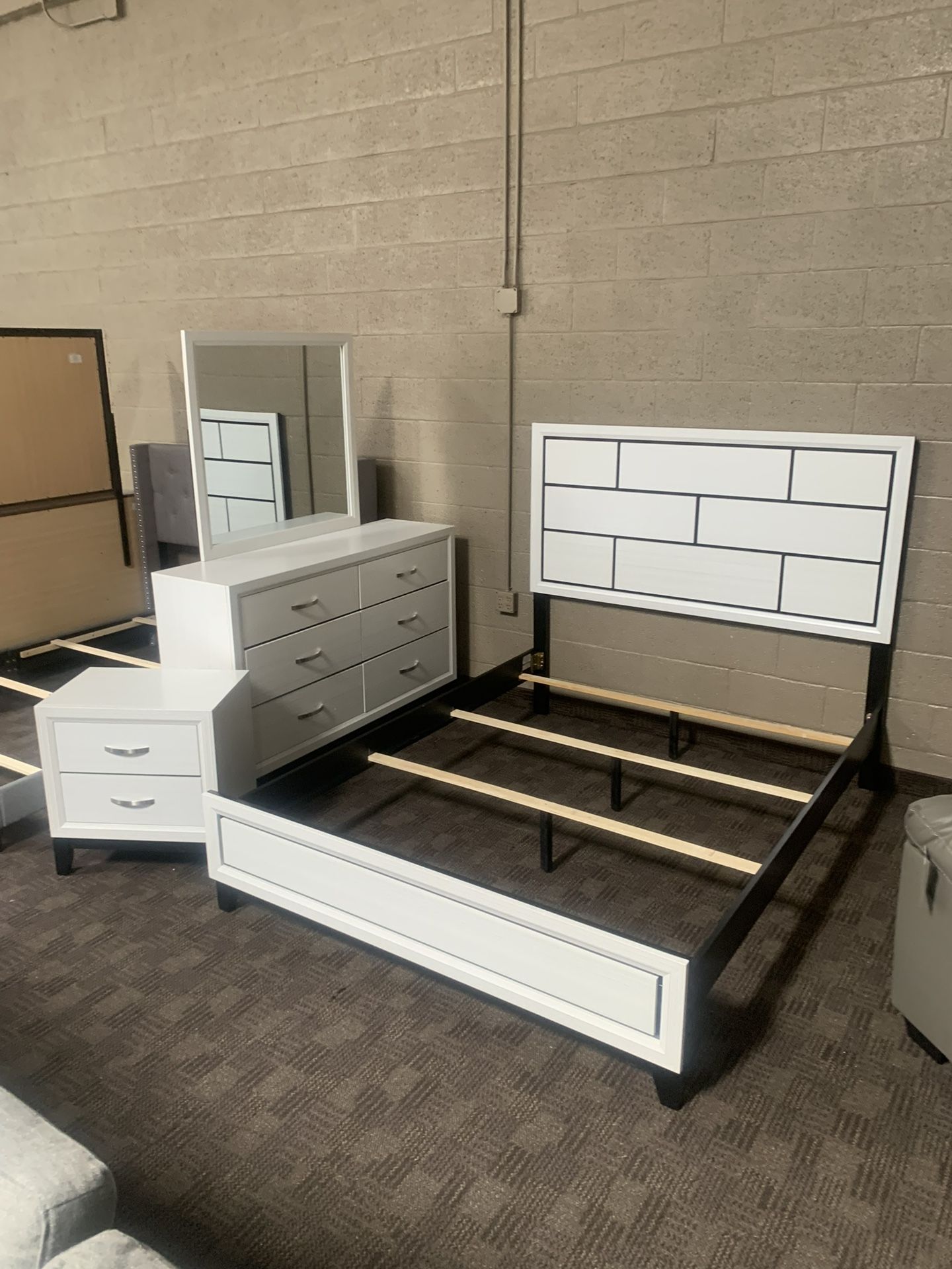 Brand new in box queen bedroom set. Includes queen bed, dresser, mirror and nightstand. Also available in king Delivery and payment plans available