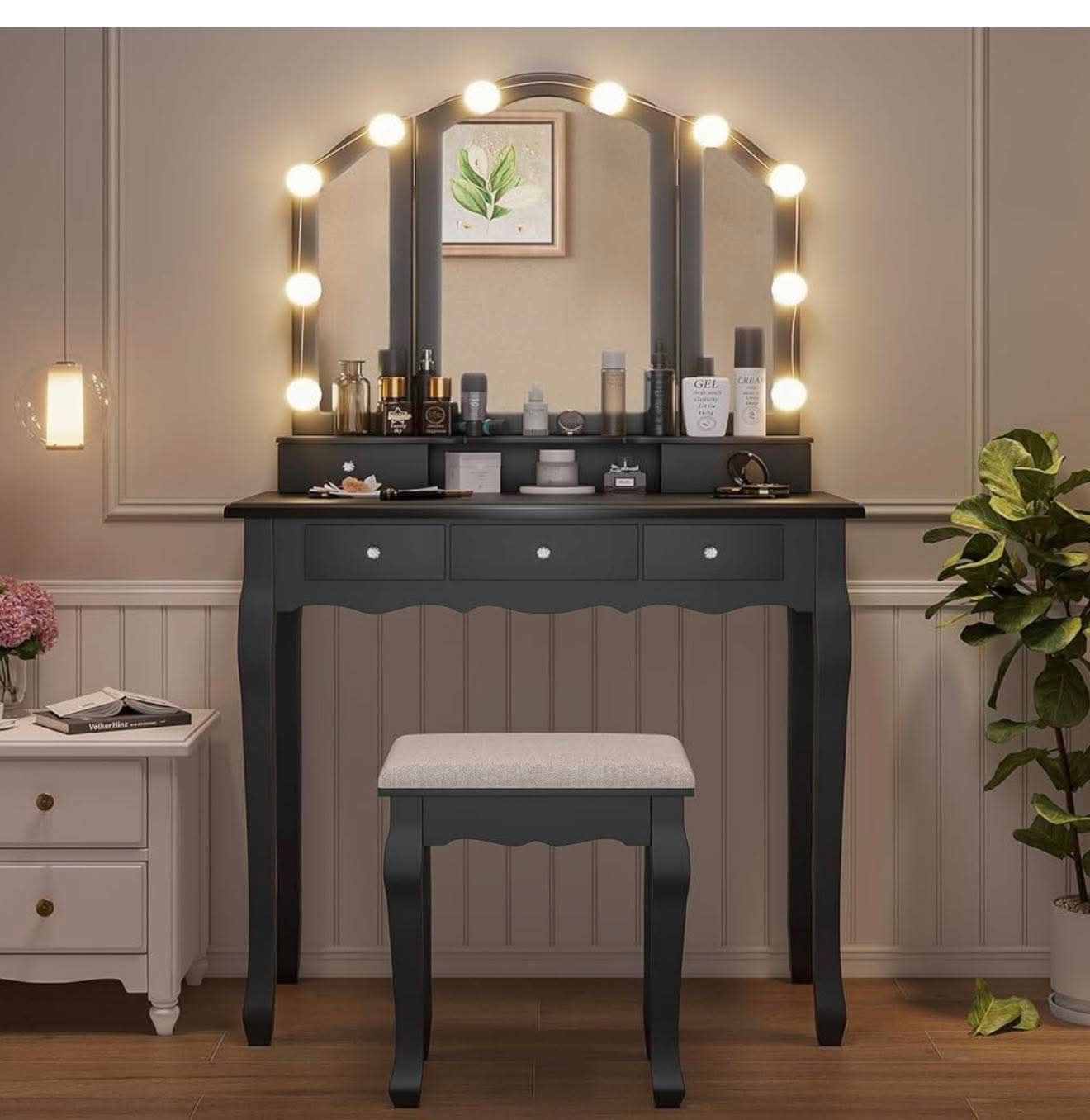 Vanity Desk, Makeup with Lighted Tri-fold Mirror and Stool, Black D-11
