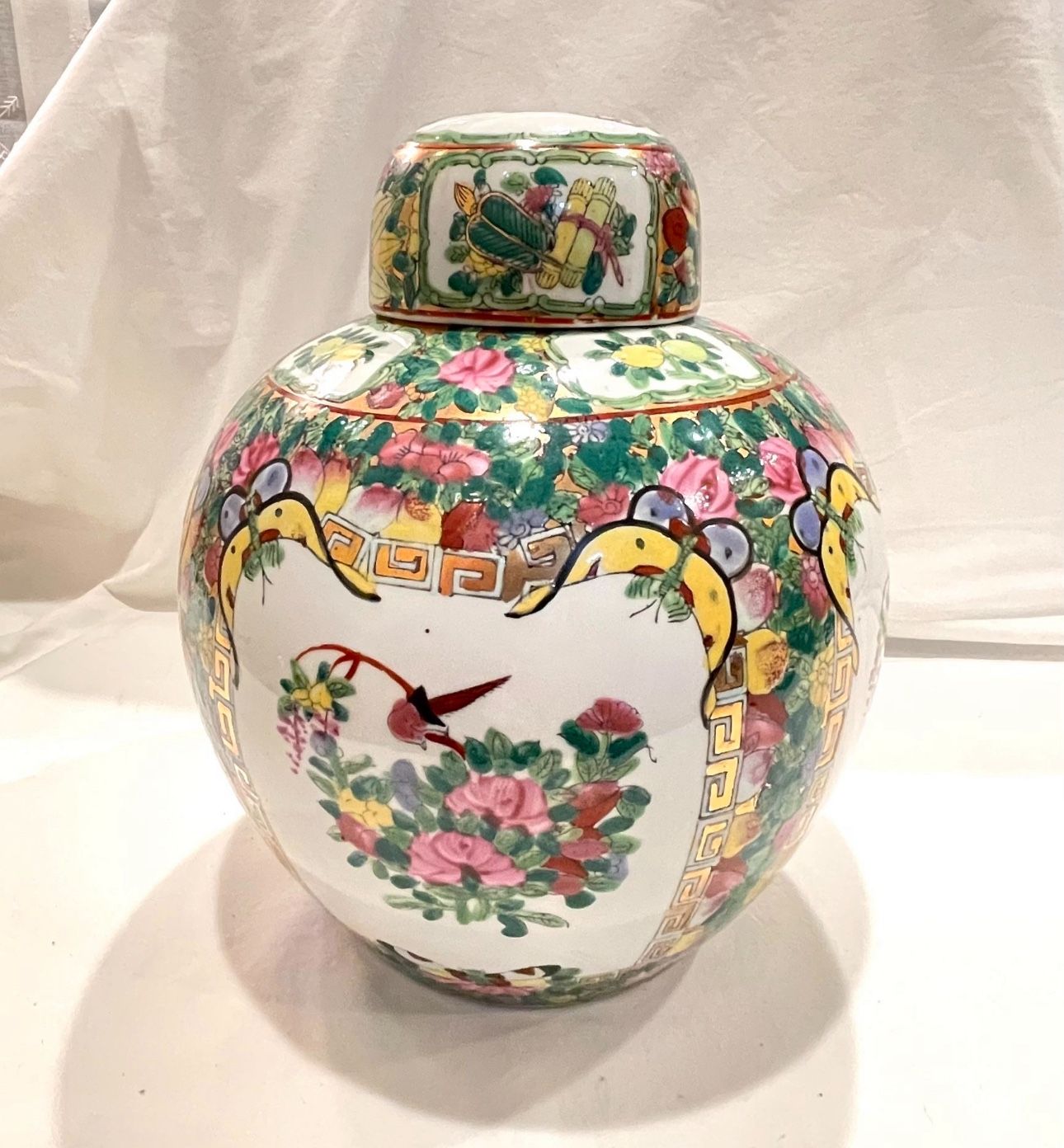 Features 4 panels of hand painted intricate designs of peonies, birds, butterflies, fruit and Greek key in bright colors or pink, green, blue, yellow and accented with gold gilt. This is in wonderful vintage condition with no chips or cracks. Measures approximately 9.75" tall and 7.5" wide. Made in China. Pickup address: Walnut City