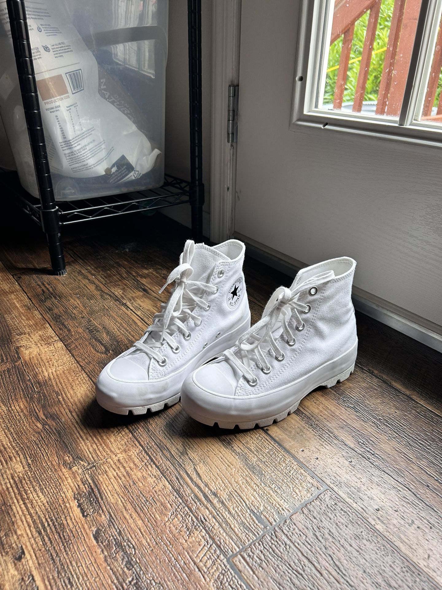 Worn about twice. Got some light brown spots on the actual platform that could be scrubbed off.