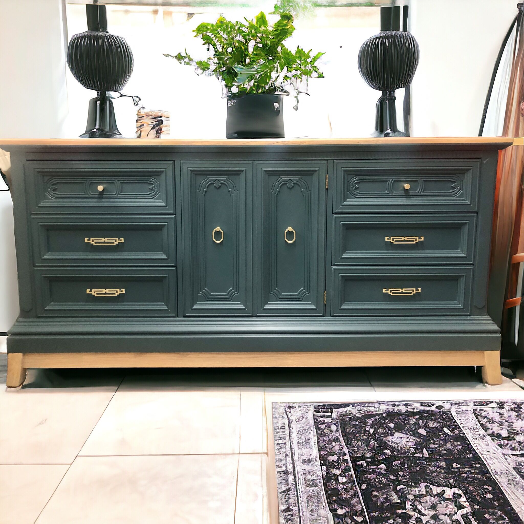 Beautifully reimagined, chunky 70s dresser… The good bones were already there, it just needed a modern twist to bring her up to date . Lovely triple dresser with all dove tailed drawers and plenty of storage space! Painted in Benjamin Moores Yorktown Green; which is a lovely deep teal. It was given a new base that was stained in a light wash to match the gorgeous top. New modern drawer pulls complete the updated look. This one would be awesome in a dining room as a buffet, or in the living room as a media center or even an entry way. Of course it can be a beautiful dresser, which was its original purpose. Dimensions are: 72 inches long, 36 tall and 18 deep. Delivery available to Murfreesboro and the greater Nashville area for a fee.