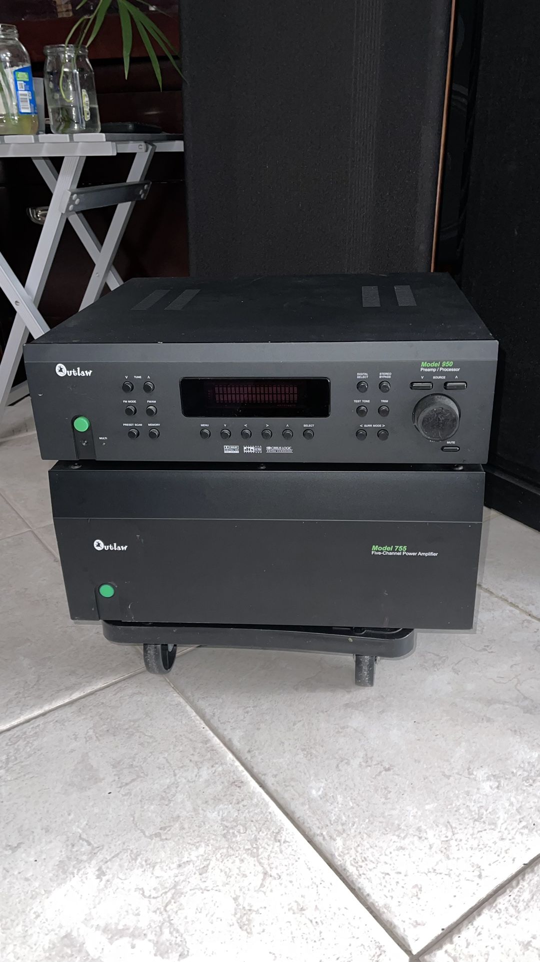 If it’s listed, it’s available!!! Must be gone today!!! The Model 755 is high-power five channel amplifier, perfect for most theater applications. A worthy successor to the award winning Model 750, it features dual-torroid transformers for space saving design. Specifications Power output: 200 watts RMS x 5 (all channels driven simultaneously into 8 ohms from 20 Hz to 20 kHz with less than 0.05% total harmonic distortion). 300 watts RMS x 5 @ 4 ohms Signal to Noise: 119dB "A" weighted Power Bandwidth: 5 Hz - over 100 kHz (+0/-3 dB) Damping factor: 850 (10 Hz - 400 Hz) Input sensitivity/Impedance: 1.43 volts for full output/28 k ohms. Crosstalk: Greater than -90 dB from 20 Hz to 20 KHz Gain: Voltage gain of 28 dB Slew rate: 50 Volts/microsecond Remote Trigger voltage: 3 - 32 volts DC Power requirements: 115 V 50-60 Hz Power consumption: 1,800 watts (maximum) Dimensions (W x H x D): 17.2 x 7.75 with feet x 18 (inches) Weight: 78 (lbs) Outlaw Audio Model 950 Preamp/Processor Specifications Audio Section Analog • Frequency response: 10 Hz - 90 kHz: +0, -3 dB (Bypass Mode) • Signal to Noise Ratio: 102 dB (Bypass Mode) • Distortion: 0.0038% (20 Hz ~ 20 kHz) (Bypass Mode) • Input sensitivity / input impedance: 200 mV/ 47kohms • Rated output: 1V(0dB gain in Bypass Mode) Digital • Signal to Noise Ratio: 102 dB • Total Harmonic Distortion: <0.005% (1 kHz, at 0 dB) • Dynamic Range: 100 dB • D/A Output: Rated output 2 V (At 0 dB playback) • Digital Input: S/P-DIF Format • DSP Processor: Cirrus® CS 49326 • ADC: Cirrus CS 5360 • DAC: Cirrus CS 4396 Video Section Composite • Video Format: NTSC • Input/Output Level: 1 volt P-P • Input/Output Impedance: 75W • Frequency Response: 5 Hz - 10 MHz -- +0, -3 dB S-Video • Signal Format: NTSC Y/C • Luminance (Y) Input/Output Level: 1 volt P-P • Chrominance © Input/Output Level: 0.3 volt P-P • Input/Output Impedance: 75W • Frequency Response: 5 Hz - 10 MHz -- +0, -3 dB Component Video • Signal Format: NTSC Y/Pr/Pb • Analog Components • Luminance (Y) Input/Output Level: 1 volt P-P • Pr Input/Output Level: 0.7 volt P-P • Pb Input/Output Level: 0.7 volt P-P • Input/Output Impedance: 75W • Frequency Response: DC - 45 MHz -- +0, -3 dB Tuner Section FM • FM Tuning Range: 87.5 MHz - 108 MHz AM • Usable Sensitivity: Stereo: 1.8µV • 50 dB Quieting Sensitivity: MONO 2.5µV STEREO 23 µV • Signal to Noise Ratio (IHF-A): MONO 79 dB STEREO: 74dB • Total Harmonic Distortion: MONO 0.2% STEREO: 50 dB • AM Tuning Range: 520 kHz - 1710 kHz • Usable Sensitivity: 25µV General • Power supply: AC 120 V, 60 Hz • Power consumption: 45W • Dimensions (including feet and connectors): 17.12 (W) x 4.6 (H) x 14.76 (D) inches, 435 (W) x 117 (H) x 375 (D) mm • Weight: 17.6 Lbs/8 kg • Trigger Outputs (x2): 12 VDC, 100 mA maximum