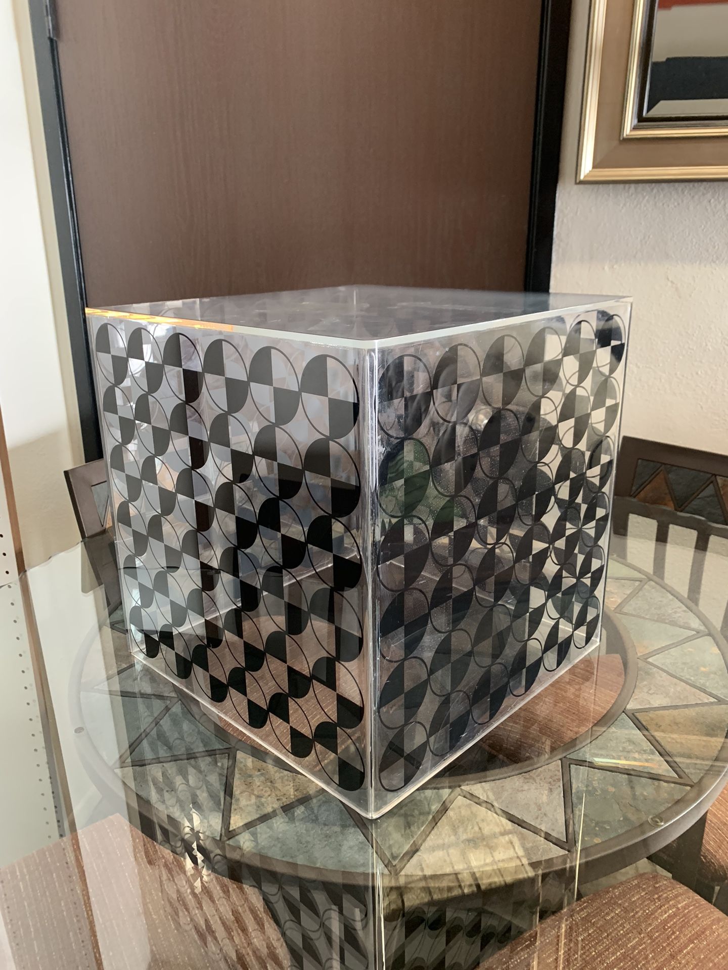 Mid 20th Century Vintage Acrylic Cube Side Table With Op Art Checkerboard Circle Pattern 16”W 16”D 16”H In the warehouse, easy to pick up No Tax No low offers please A lot of furniture and other items are available, check out our listing And there are many items other than the list, visit our thrift shop in the warehouse New items arrive everyday Follow us on OfferUp @syuu or FB @Syuu You to get new arrival items information