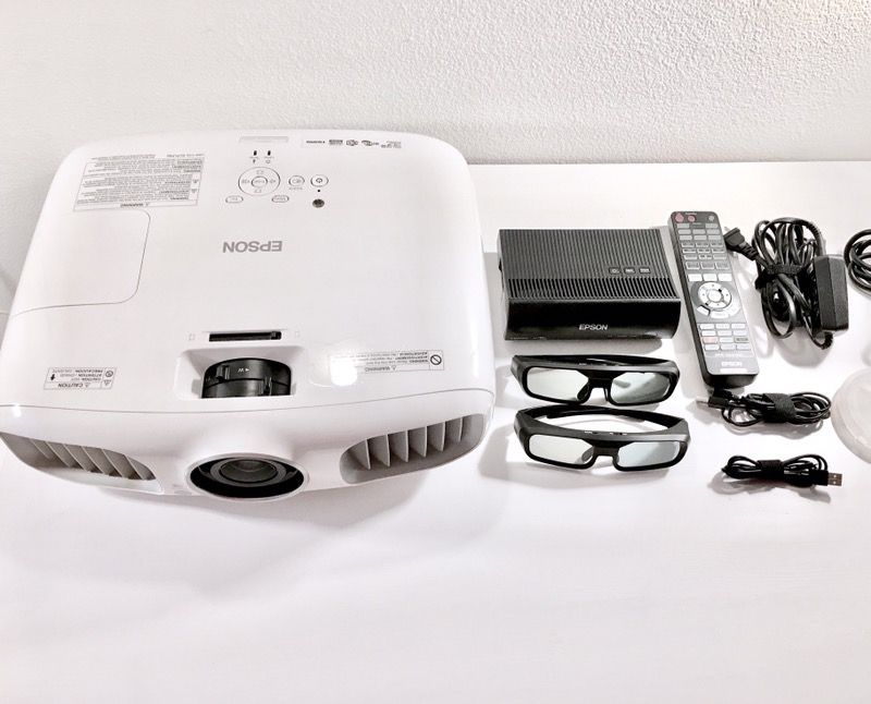 Item is in excellent condition -2 rechargeable 3D glasses -Projector has new authentic Epson bulb -Comes with FAVI 100-inch (16:9) Electric Projection Screen (motorized, with remotes) -ceiling mount