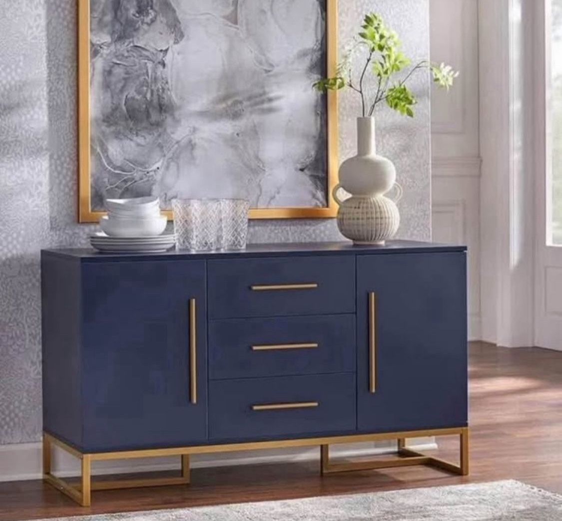 New Indigo Blue Dining Room Server Storage Sideboard Buffet Server TV Stand • Dimensions: 47.6” W x 28” H x 18” D • New In the Box - This Has Excellent Reviews and is in Excellent Condition Features: Back panel grommet cut-outs allow for cord management * Stunning indigo blue finish * Accented with gold-tone hardware and metal legs Verified / Trusted Seller - See My Reviews