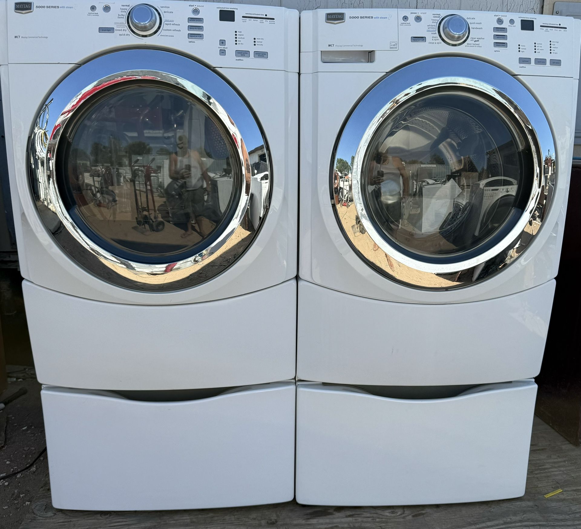 Maytag washer and dryer set in good working condition 60 day warranty parts and labor other sets available local delivery drop off $60 installation available at additional $25 stairs is not included Se Habla Español