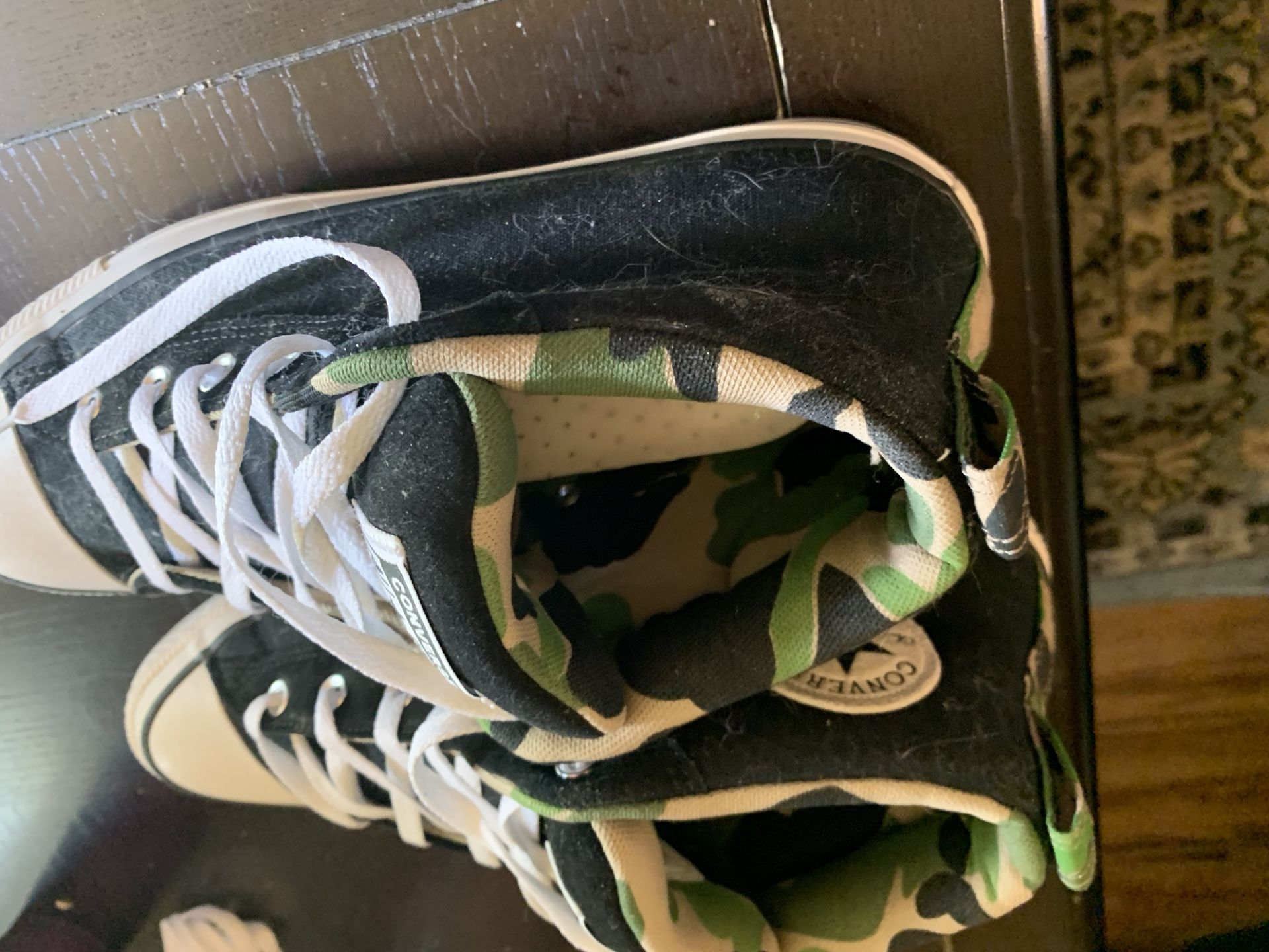SAME. COOL. CONVERSE SHOES. BLACK OUTSIDE. Padded. CAMOUFLAGE. INSIDE. TENNiS. SHOE. SIZE. 13. MENS $45.00 BRAND NEW. NEVER. WORN. OUTSIDE. CALL. (contact info removed). JOE. (contact info removed)