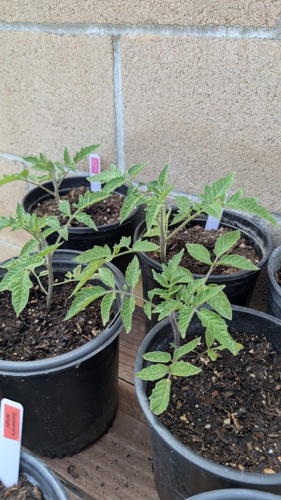 Different varieties of organically grown heirloom tomatos in 1 gallon pots San Marzano paste tomatoes Napa Chardonnay Blush cherry tomato Yellow pear cherry tomato Stupice tomato