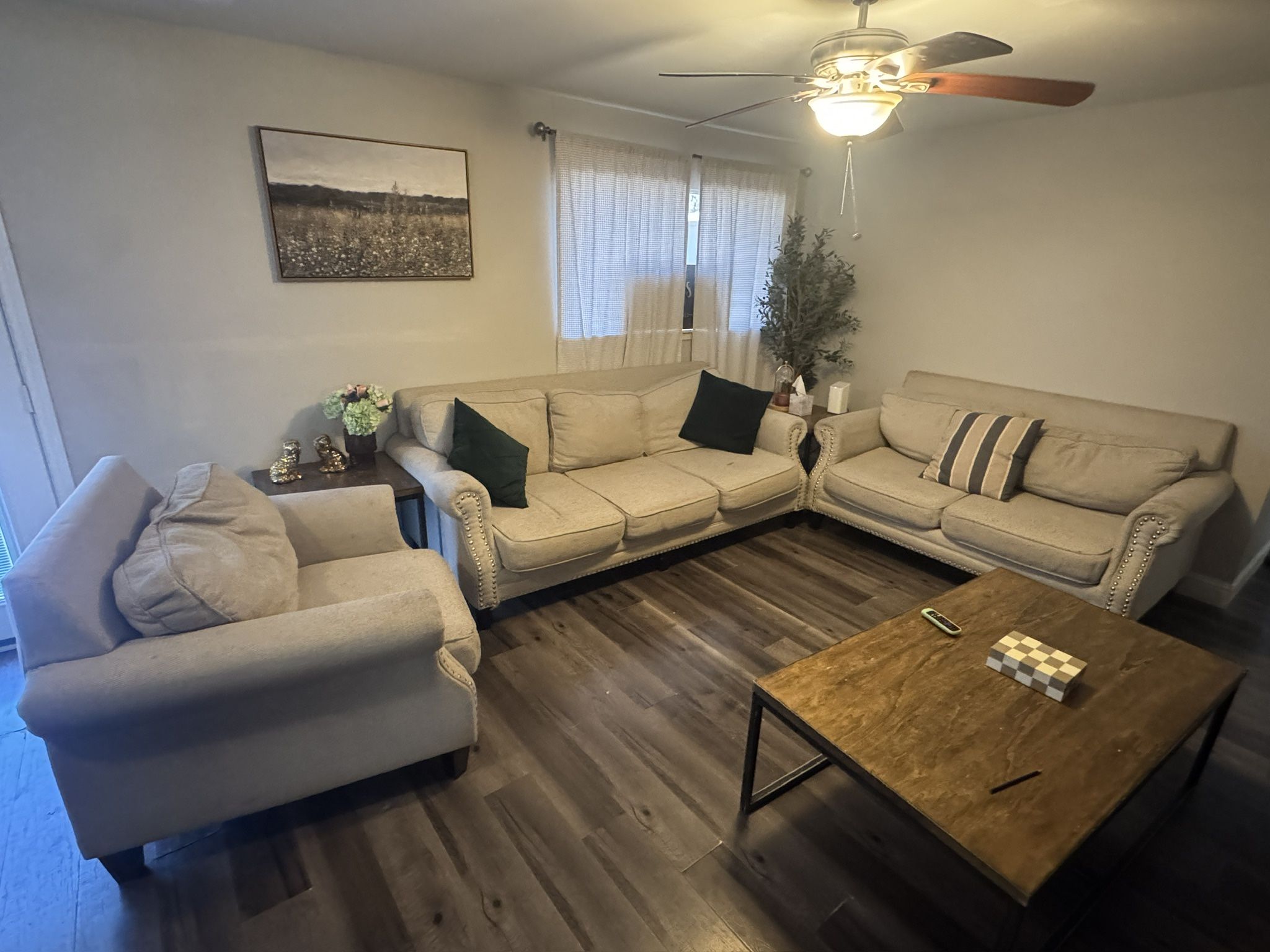 Set is in ok conditions can use some cleaning. $300 OBO 3 piece living room set comes with tables. 1- armchair 1- sofa 1- loveseat 1- low large coffee table 2- low tables(fit under coffee table) 2- tall tables Must go all together can deliver close to 77075 (Hobby Airport)