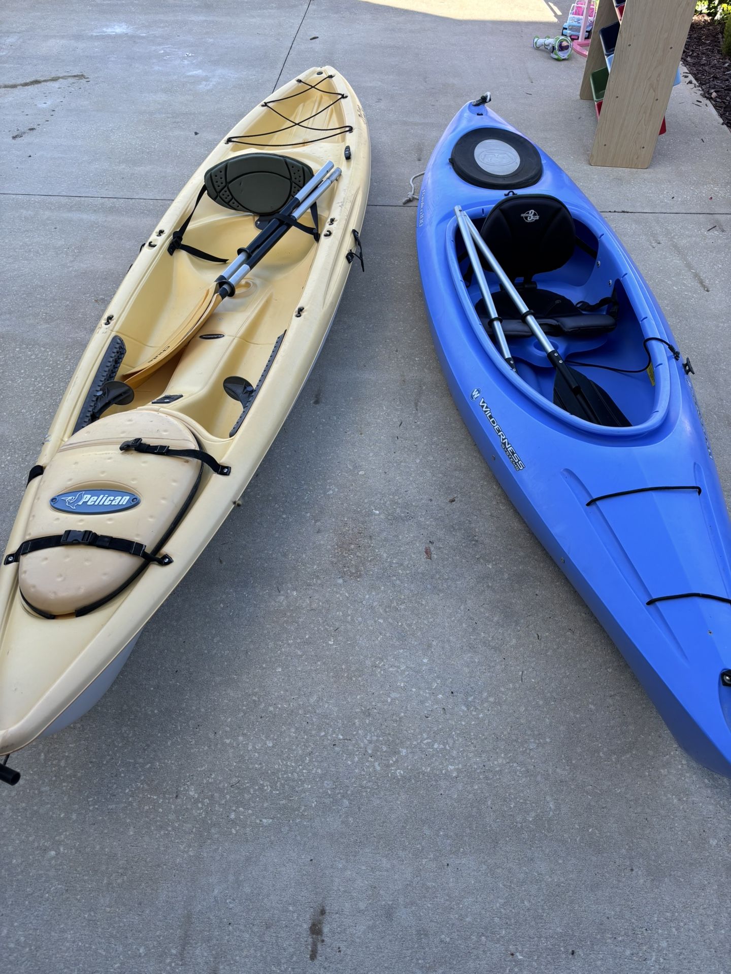 Two individual kayaks for sale. The blue one is a Wilderness Systems brand and the other yellow one is a Pelican brand. Both in good shape with no leaks and both come with oars. Asking $175 individually or $300 for both. Thanks!