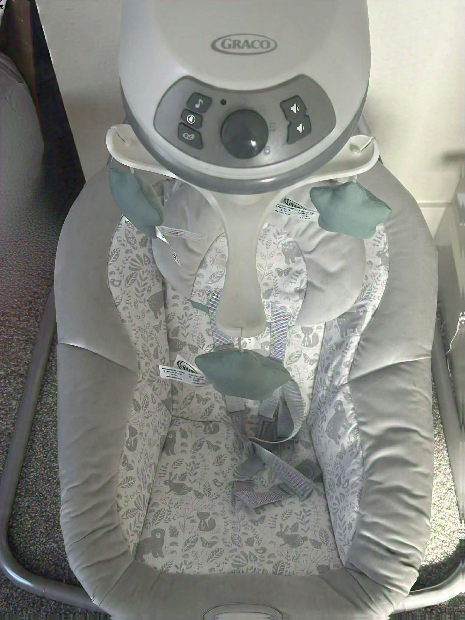 Side to side motion. Vibration. Music and nature sounds. Outlet or battery powered.