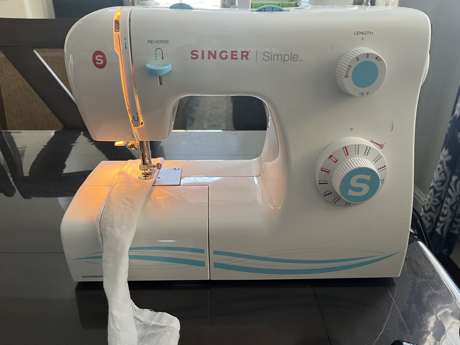 Singer Simple sewing machine. Is a little old but works normally. May get stuck every once in a while but not too problematic. Also has a little storage area in it.