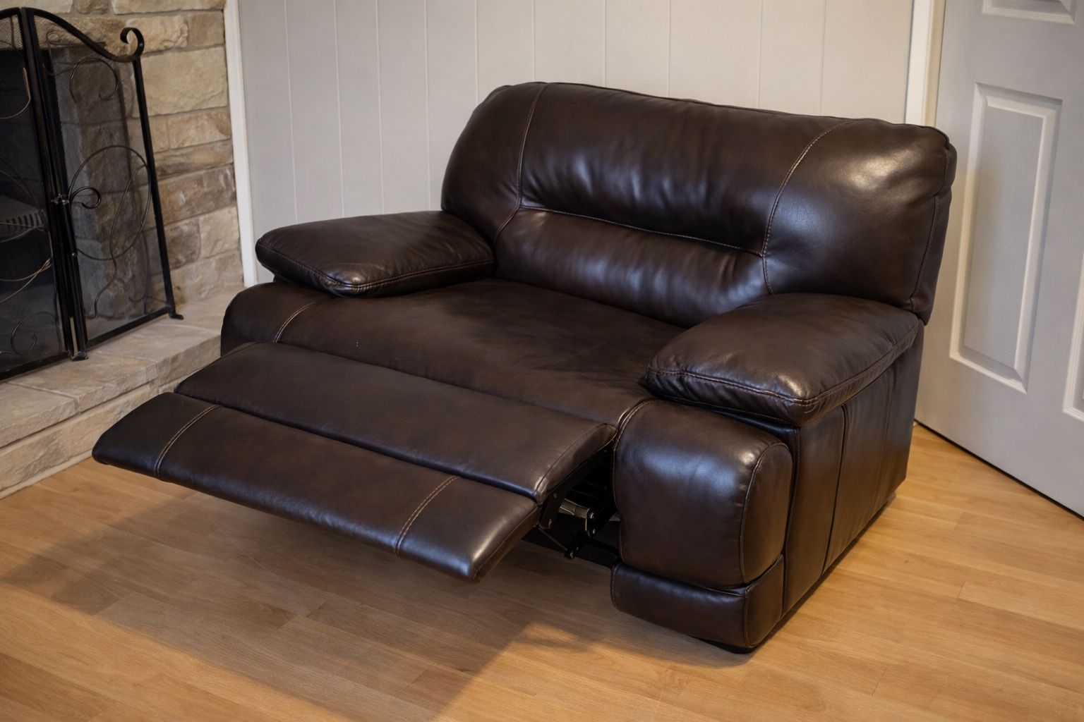 Genuine Leather Power Reclining Loveseat – Dark Brown Beautiful and very comfortable genuine leather power reclining loveseat in a rich dark brown color. This loveseat features a solid wood frame and an electric power recliner that easily extends the footrest when plugged into a wall outlet. Perfect for relaxing, watching movies, or adding a comfortable seating option to your living room or family room. Features: • Genuine leather upholstery • Solid wood frame construction • Electric power recliner (plug-in) • Very comfortable and spacious seating • Elegant dark brown color that fits many interiors Condition: Overall in good condition and fully functional. The recliner works perfectly. There is one small tear on the upper back area of the leather (shown in the photo), but the rest of the sofa is in very good shape. Pickup only.