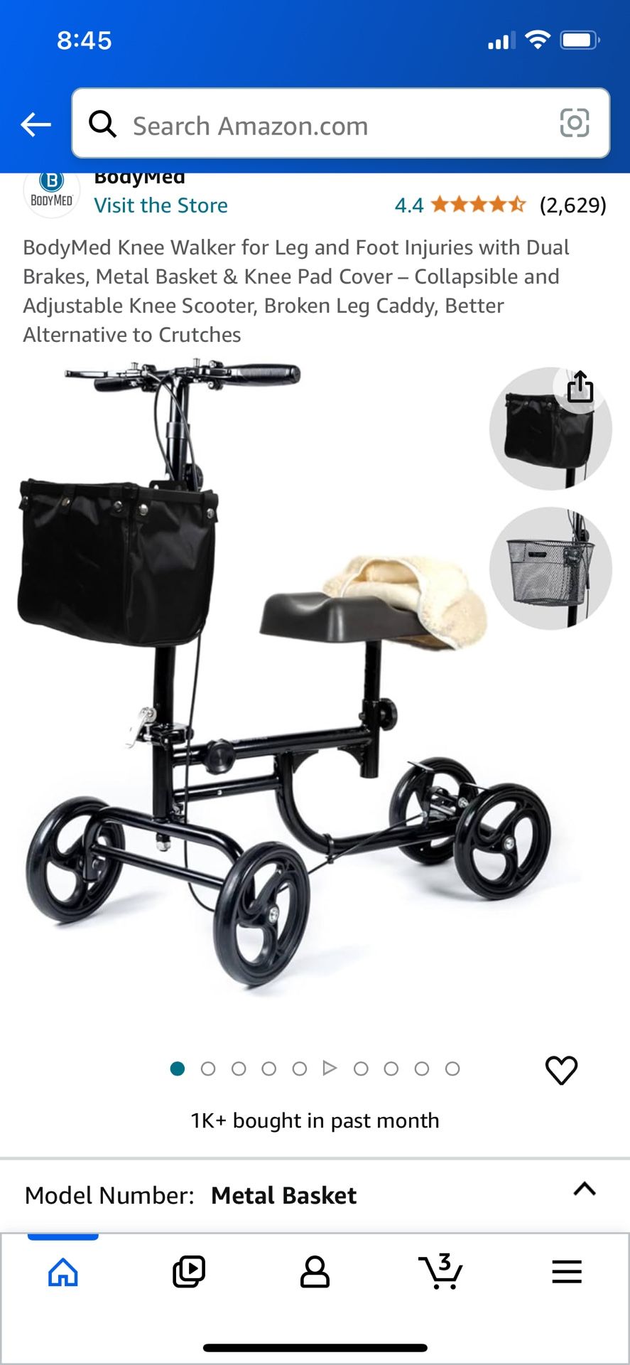 Body Med Knee walker with removable basket, collapsable option for easy travel. Used for three weeks and is in original packaging.
