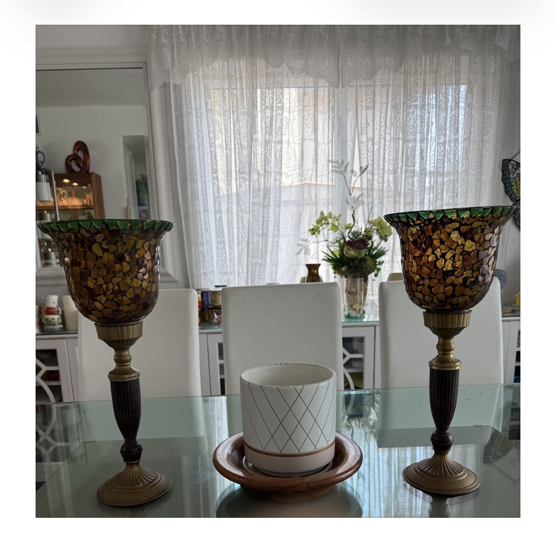 Tiffany style Antique, stained glass, matching candle holders
