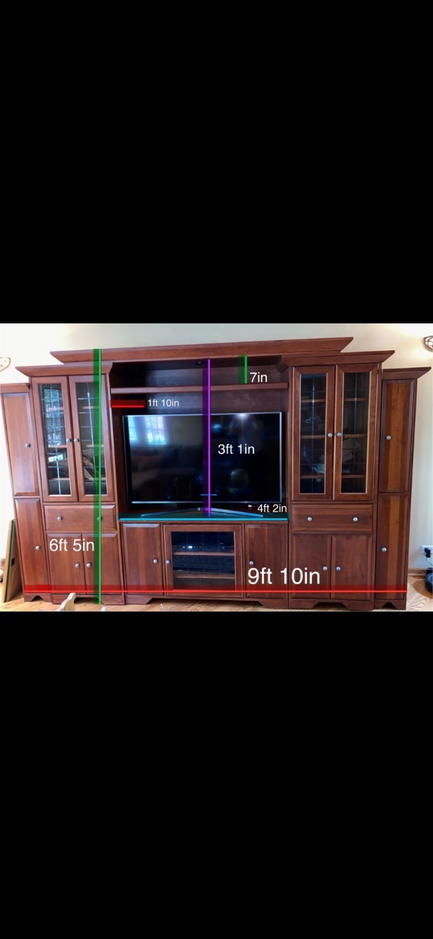 It’s in storage now but I can “fix” scraps, help delivery and freshen it up. I was in a rush when moving . Scrapes are not visible when TV is in the unit No other scrapes on rest of unit I have measurements for each section Message an offer if you’re interested!