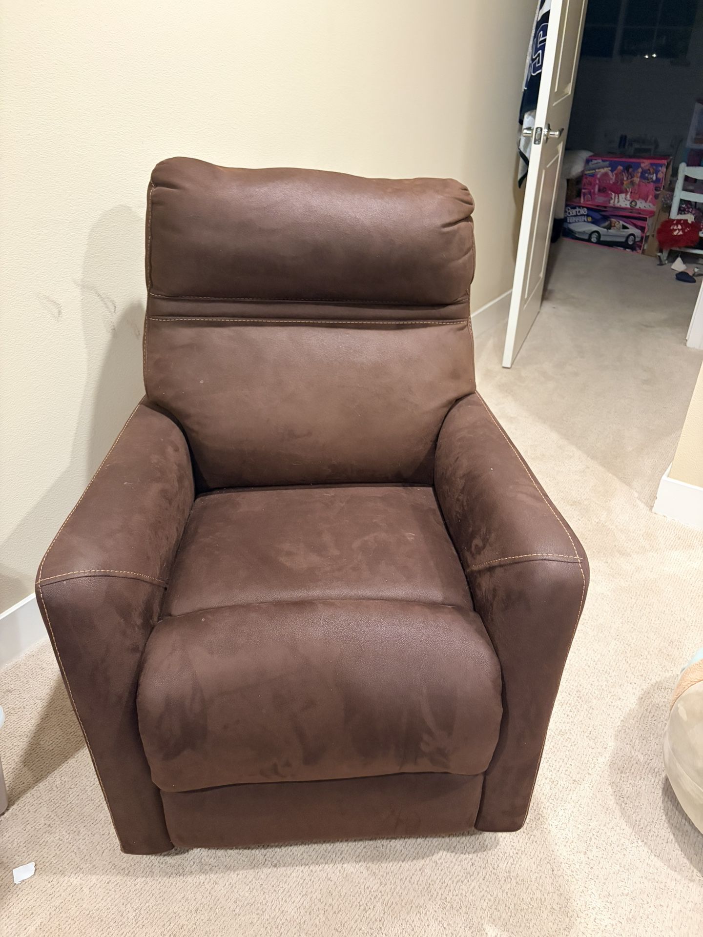Nearly new recliner bought at living spaces . Slim design fully automatic and working no rips or tears no pet home no smoking home. Using at a chair to pile clothes on so hardly sat in.