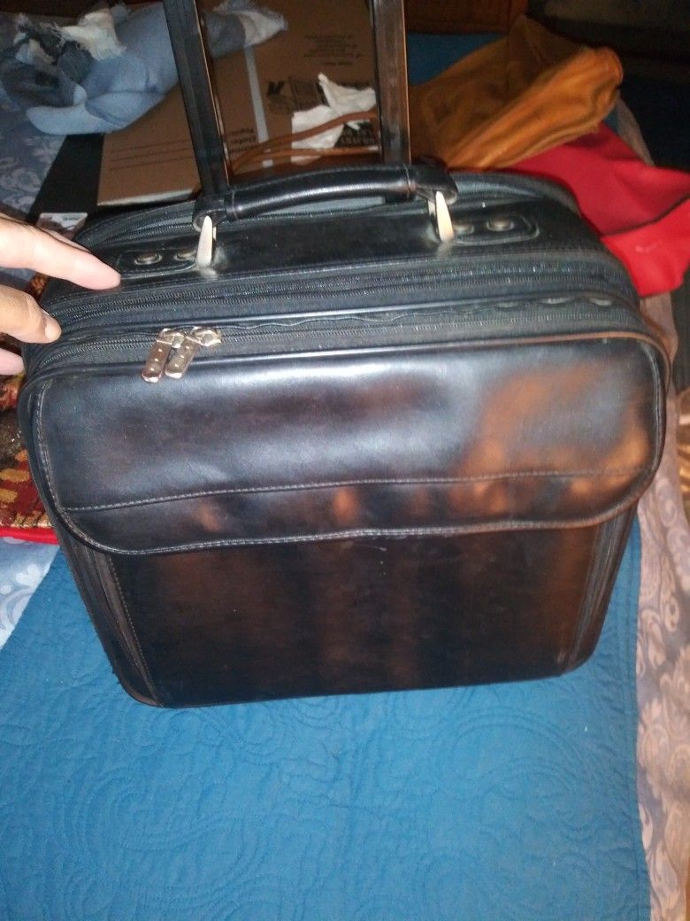 Compact leather suitcase Black leather...very good condition Only used once Retractable handle Wheels on the bottom Very roomy and expendable Light weight and compact for easy travel and carry on No scuffs or scratches