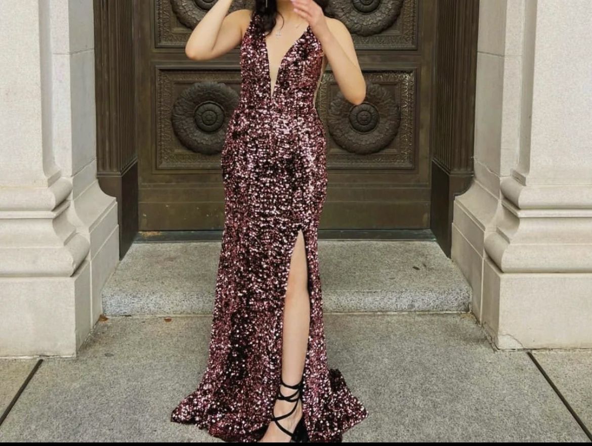 Size: XS but can fit a small! Very good condition and I only wore it for prom! This dress is very elegant and sparkles very nicely in real life as well as in pictures! There is a slit on the leg so it is very easy to walk in. For reference I am 5 feet 2 inches. I wore some heels and it was manageable to walk in for me! It also has very cute mesh on the sides for more design to the dress. Worn once and the price is negotiable! Hablamos español!!