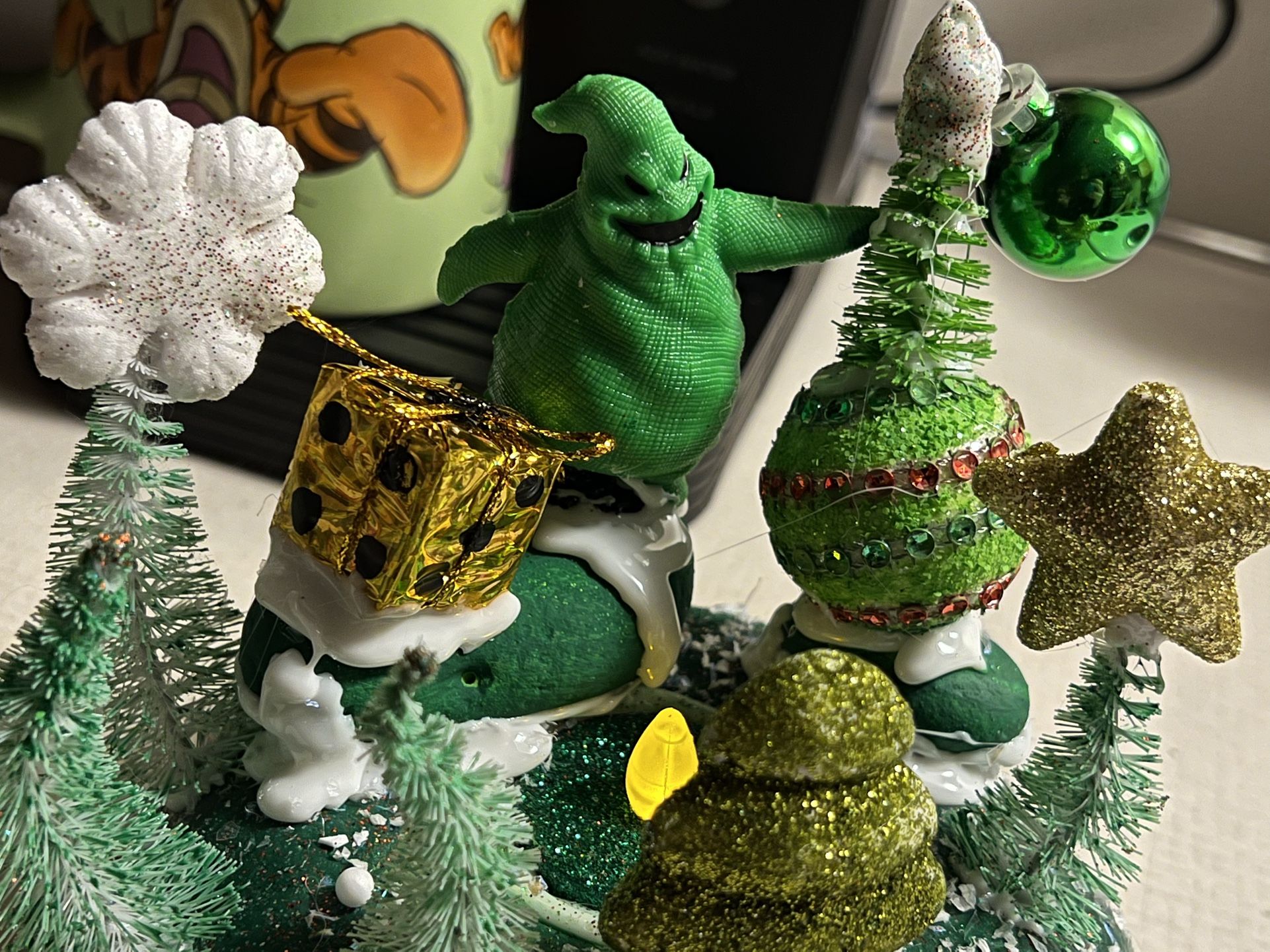 The “Boogie” Created and painted by me! From various natural/artificial materials! **Includes removable tea light for battery changes. **Sits easily on any shelf. **Trees glow in the dark as well! *Does have small parts so please keep out of reach of little ones ;) *
