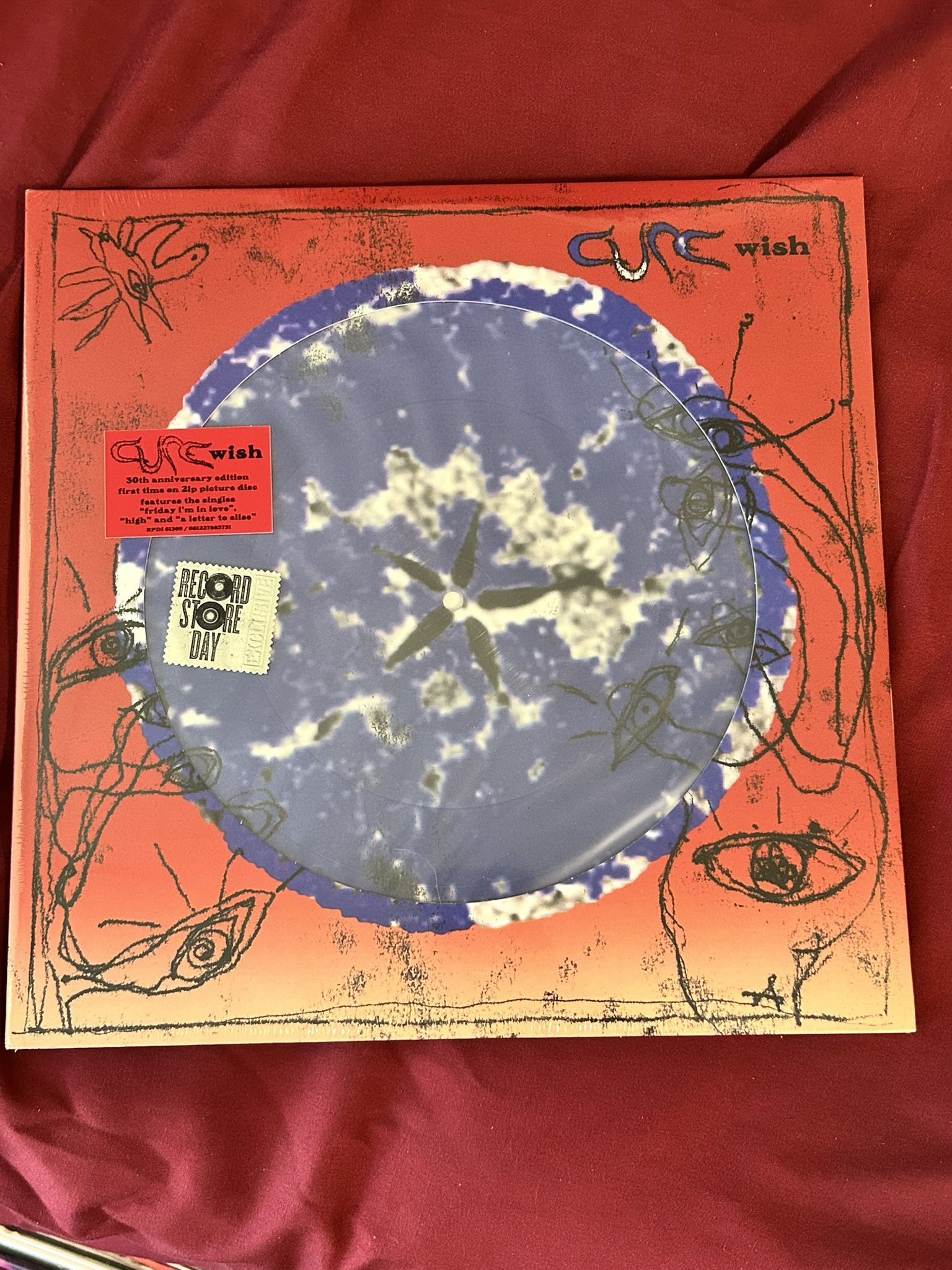 The Cure’s album Wish on a picture vinyl of the album cover. This was a limited release only available at local record stores for Record Store Day in November 2022. Still sealed and mint condition.