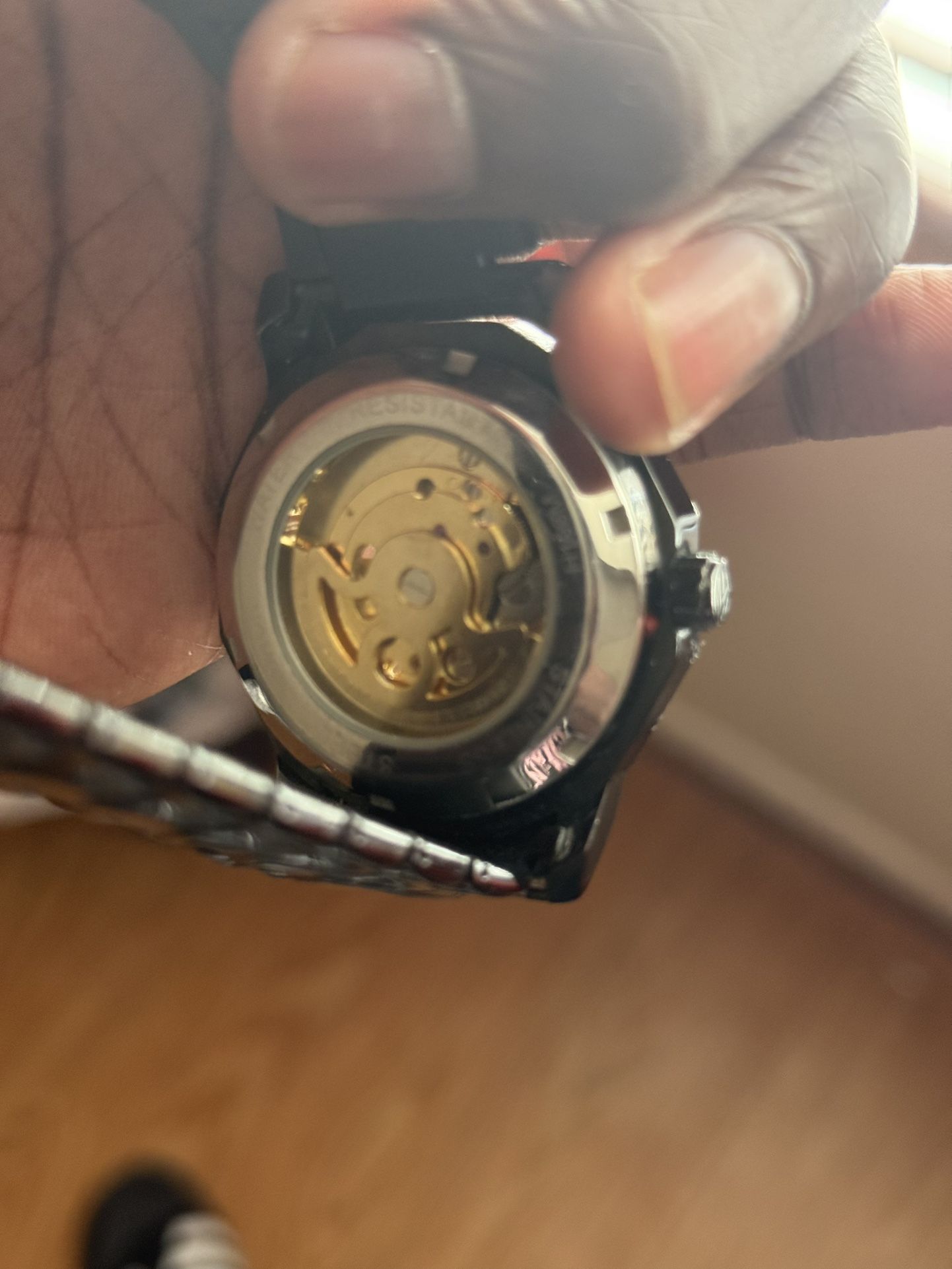 Men’s unbranded skeleton automatic wristwatch with visible mechanical movement. Black metal case and bracelet with gold-tone open-work dial. Case back marked stainless steel and water resistant 199m. Pre-owned, in good condition with light cosmetic wear from normal use. Water resistance not tested. Case back marked “Stainless Steel” and “Water Resistant 199m”. Water resistance is not tested and cannot be guaranteed due to age/previous use.