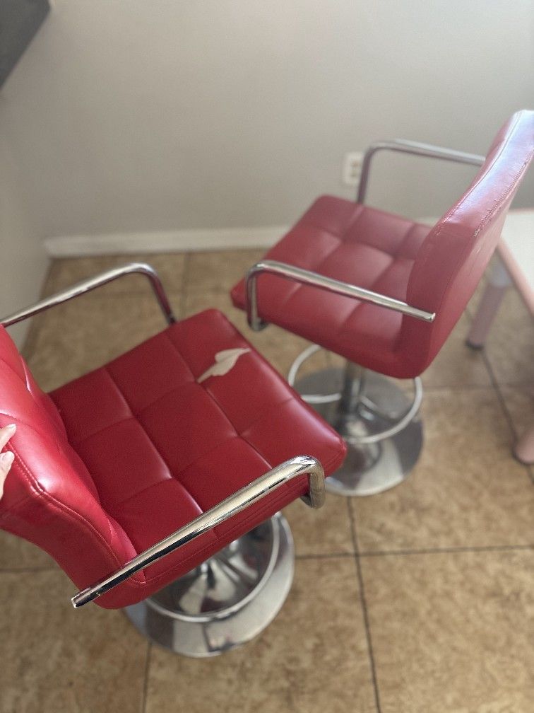 Metal bar stools Leather seats Red seats One let is broken at the bottom just the adjustable part not the entire leg price. A rip on the top of the Leather on one seat
