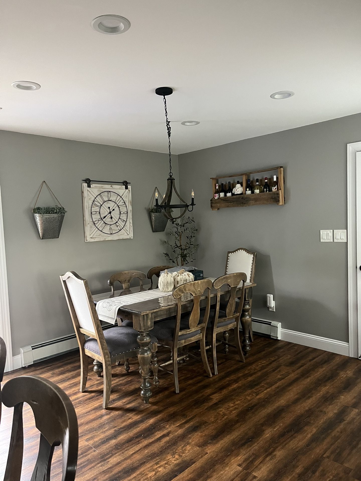 LIKE NEW! Canadel dining room set. This is REAL CUSTOM HARDWOOD. This set was made to order. Perfect condition only used 1-2 a year. Set comes with table, 6 chairs including 2 captains chairs, 2 extension leaves and 3 matching counter height stools. Dining set and stools can be sold separately. This solid wood is distressed and a farmhouse style. The chairs are custom upholstered dark grey. There are no stains or tears. Table measures 60 inches long without leaves. Will also include table clear protective cover. Table lets come off for easy transport. Serious injuries only. This set is worth 8k. Furniture is not made like this anymore. Pick up in Clark Nj.