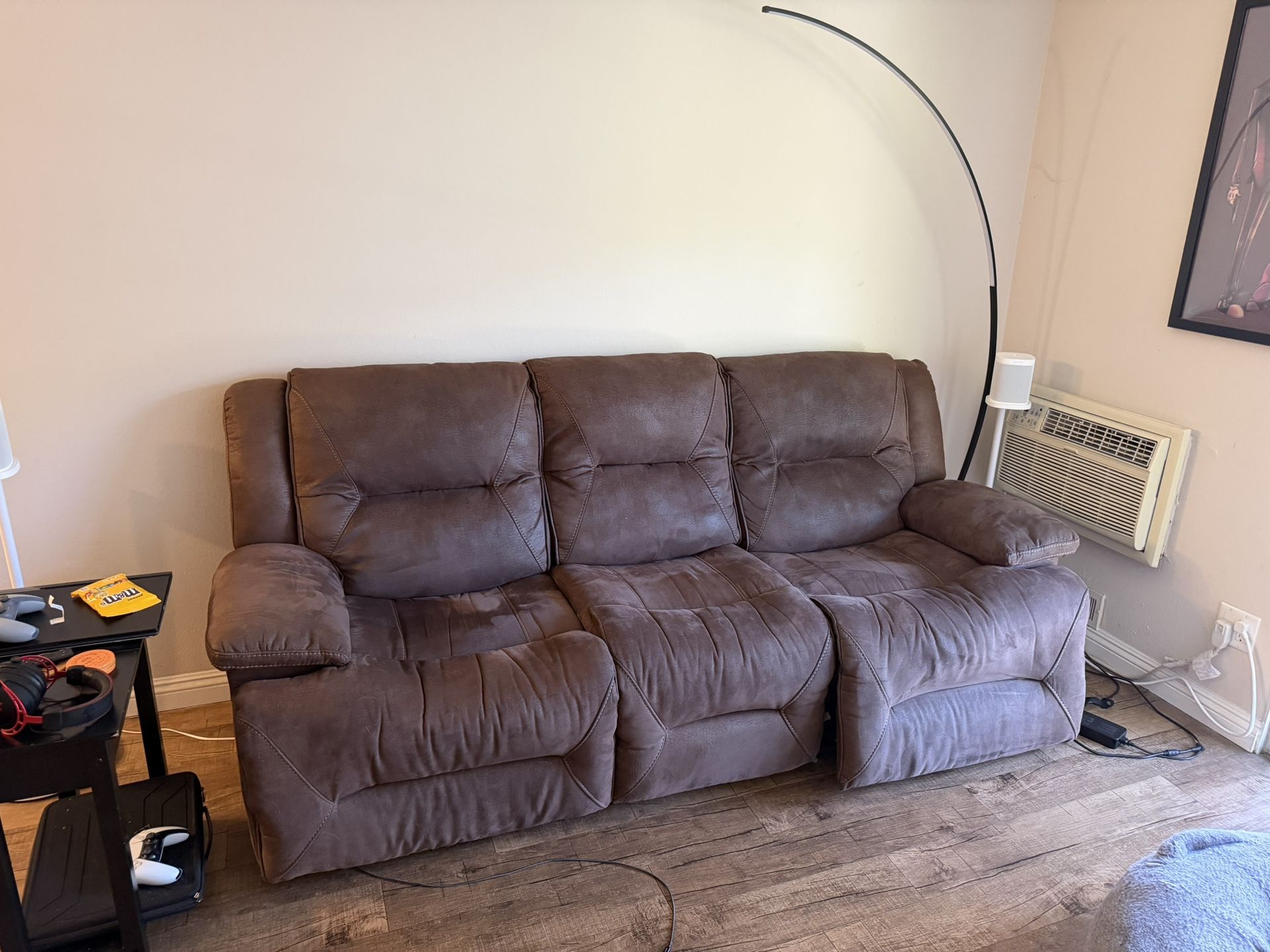 Calder Brown Power Reclining Sofa – AS IS Large and comfortable 87” power reclining sofa in chocolate brown microfiber. Both ends recline electronically. KD (removable) back makes it easy to move through doorways. ⚠️ Selling AS IS – please read before messaging: ∙ One power recliner has a loose wire/harness connection. The motor works fine — if you wiggle the wires it will recline. Needs a wiring repair. ∙ Power cord has an exposed wire that has been wrapped in electrical tape. Great opportunity for someone handy who wants a solid, comfortable sofa at a steep discount. Cosmetically in good shape for its age. 📏 87” wide 🛋️ Chocolate brown microfiber ⚡ Power recliners on both ends with 2 USB ports 📦 Back removes for easy transport $100 OBO, Local pickup only.