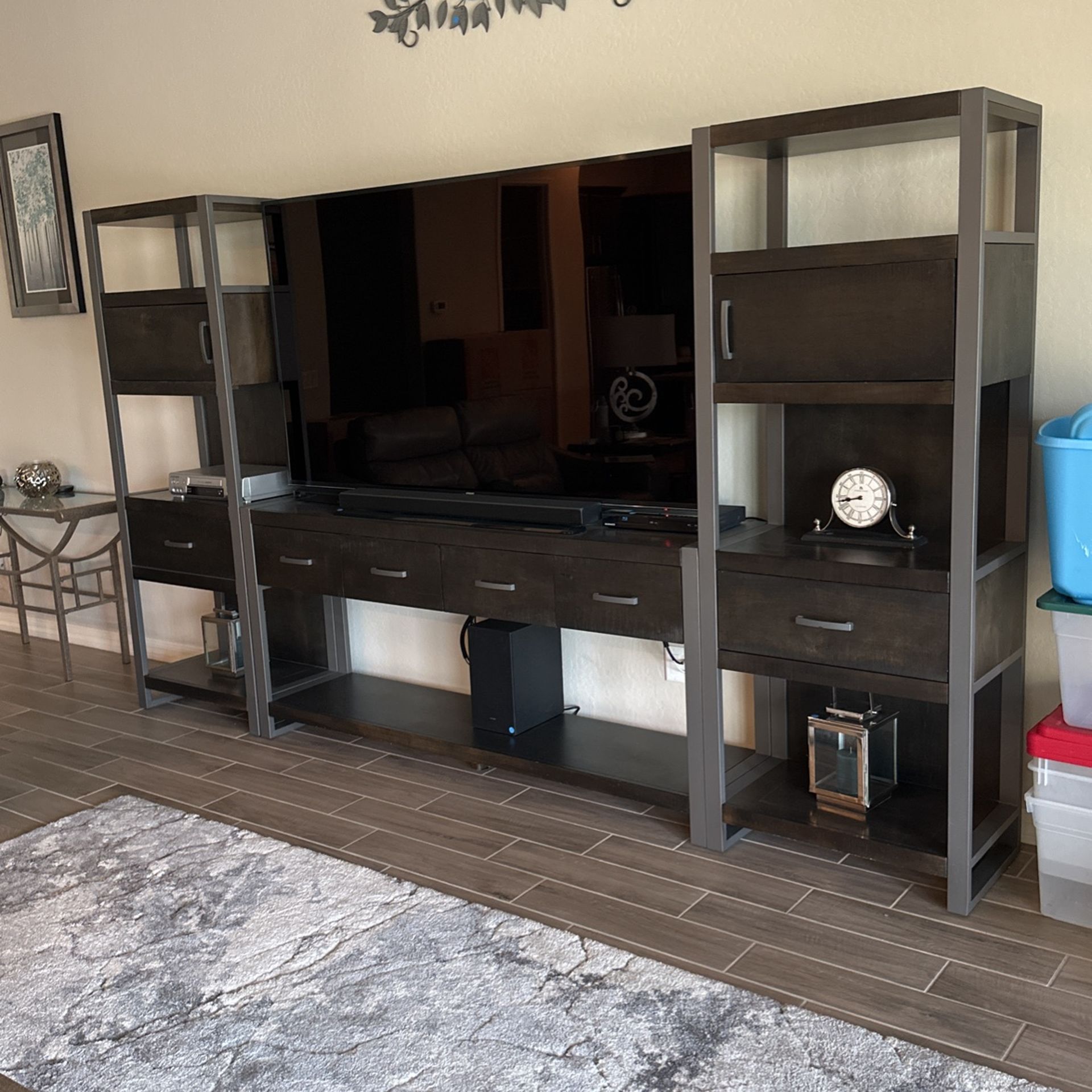 Three piece set includes two towers & one center shelf unit. Contemporary design is dark espresso color wood accented by gunmetal gray metal framing & cabinet/drawer handles. Towers each measure 28” x 74” x 16.5” & has 4 shelf levels, 1 cabinet & 1 drawer. Separate center unit measures 72” w x 33”h x 16.5” d has 4 drawers & bottom shelf. Easily holds 75” TV (TV is sold) as pictured.