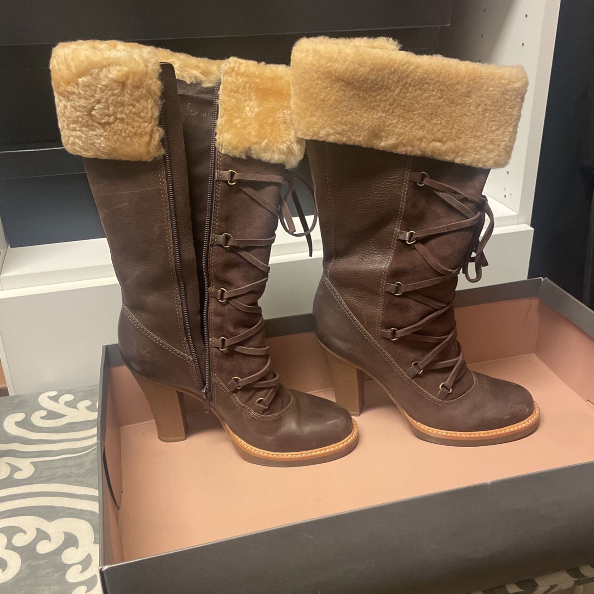 Fur trimmed brown boots Inna great condition , high heel