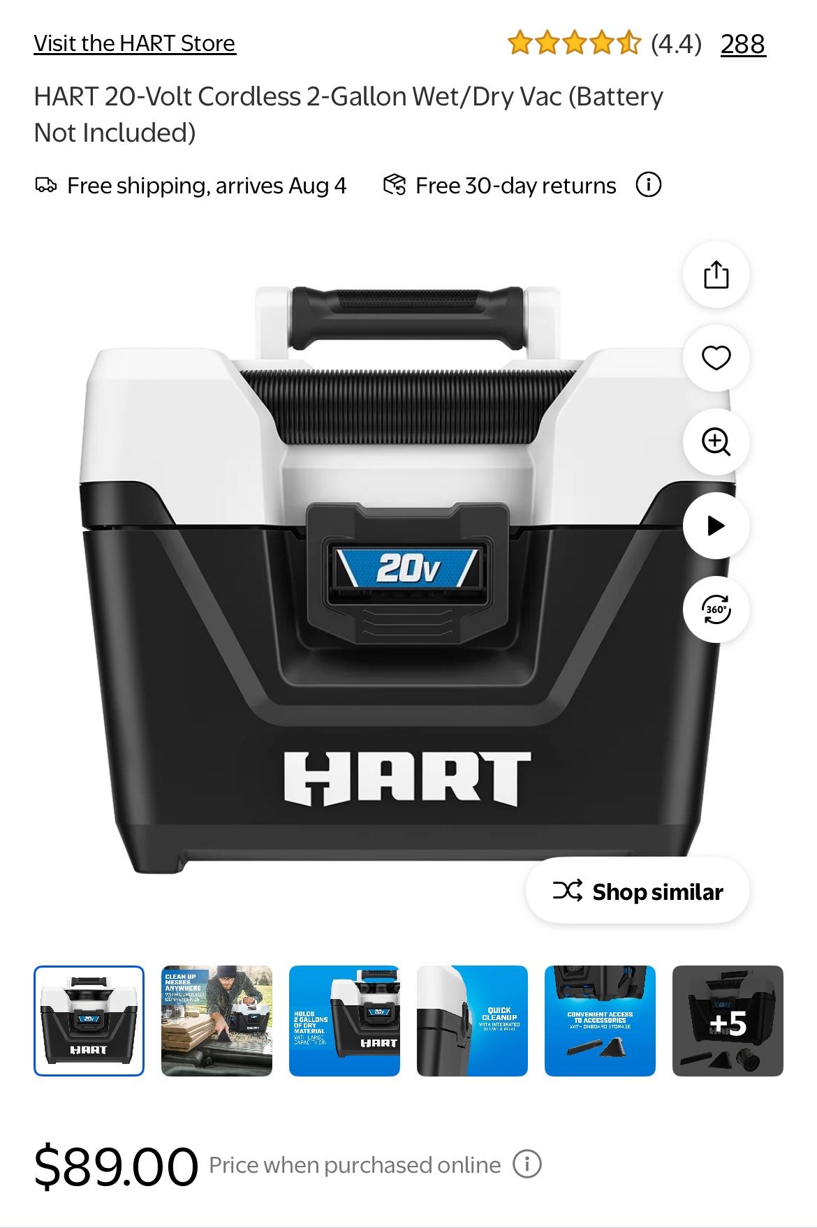 HART 20-Volt Cordless 2-Gallon Wet/Dry Vac (Battery Not Included) Key Features 20V Lithium-Ion battery and charger sold separately Includes ultra flexible hose, utility nozzle and crevice tool for variety of applications Integrated blower port allows for quick cleanup On-board accessory storage for convenient access Pivoting air inlet for multi-directional uses Includes: 2 Gallon Wet/Dry Vac, 6' x 1-1/4" Flexible Hose, Utility Nozzle, Crevice Tool, Pleated Paper Filter and Operator’s Manual Specs: Battery: 20V Lithium-Ion Capacity: 2 Gallon Wet/Dry Weight: 8.5 lbs.