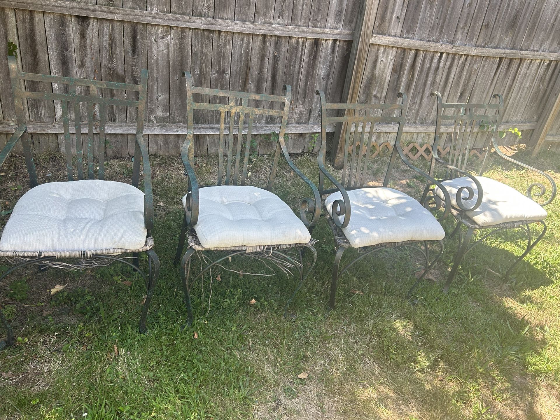 4 heavy duty steel chairs. 2 are in good shape and two need some attention ( only if you use them without the cushions) - see photo. No rust. Heavy metal.