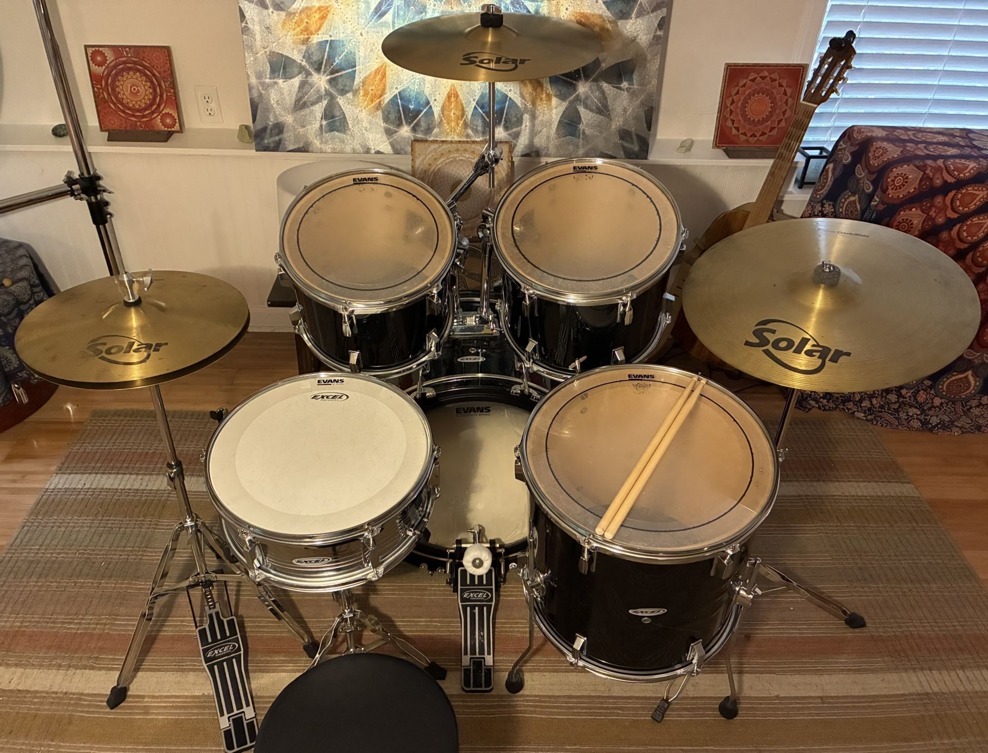 Excel Percussion drum set with upgraded cymbals and drumheads on the bass drum and toms excellent condition, tuned 22” bass drum 12” and 13” toms 16” floor tom 14” snare drum Evans Emad drumhead on the bass drum, Remo Pinstripe drumheads on the toms, Excel coated drumhead on the snare drum Evans dampening rings on the snare drum and toms 14” Solar hi hat cymbals 16” Solar crash cymbal 18” Solar crash/ride cymbal bass drum pedal hi hat stand snare drum stand cymbal stands adjustable clamp + cymbal support arm drum seat drumsticks tuning key