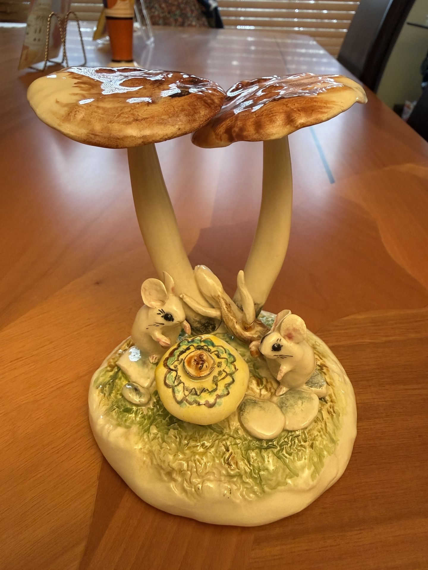 Vintage One of a Kind Molla Studio Art Pottery Vancouver Canada Ceramic Figurine This captivating piece is a truly one-of-a-kind creation, a testament to the artistry of Mollie Carter for Molla Canada. It features two cute mice dining under mushrooms. Each detail speaks to the handmade nature of this figural ceramic art. As a vintage and rare find, this particular piece is more than just a decorative object; it's a unique collectible, embodying the distinct style and craftsmanship associated with Mollie Carter's animal art pottery. Owning this artwork and its enchanting woodland setting offers a tangible connection to a bygone era of artisanal creation. Approximately 4.5” tall, excellent condition with no chips/cracks. Priced to sell (look at the pricing of analogous artwork).