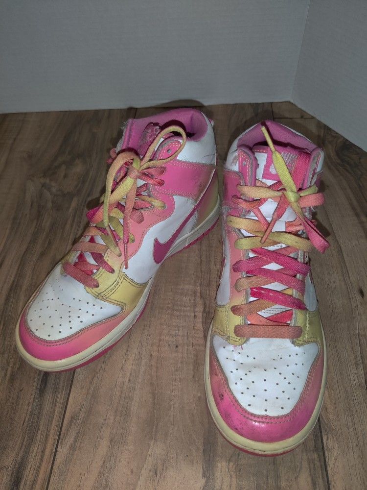 Nike Dunk High Pink / Yellow 2008 316604-161 GS Size: 4.5Y / Women's Size: 6. Has wear from age and use. Sold as is.