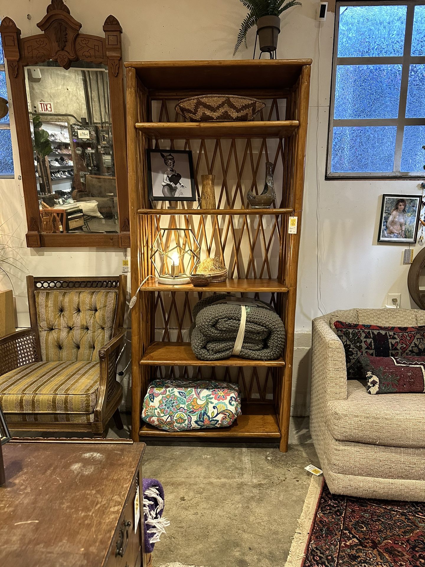 Beautiful open brown bamboo bookshelf with five shelves. Some scratching and wear on shelves as pictured. H 71.5’ L 31’ W 14.5’ Shelf depth is 12’ If this listing is up, it is still available! Although we don’t hold items over social media, you can call to purchase it or come view it in person at Artifact at 3630 SE Division St for a closer look. We’re open 11-7 Wed-Mon. Let us know if you have any questions!