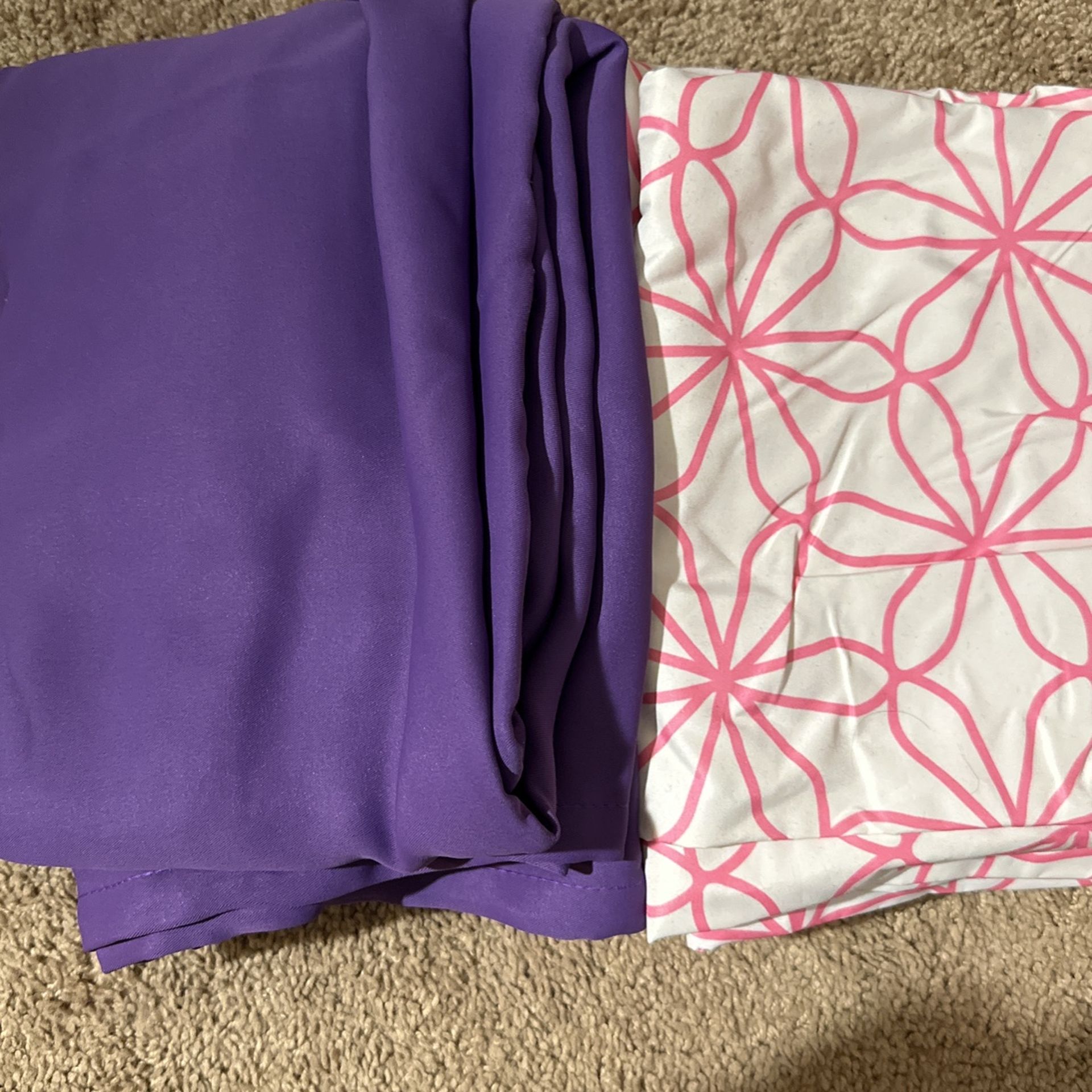 Blackout curtains. I believe they’re 84” long. I have 2 sets. One solid purple and the other is a pink and white flower pattern. Never used. $15 a set