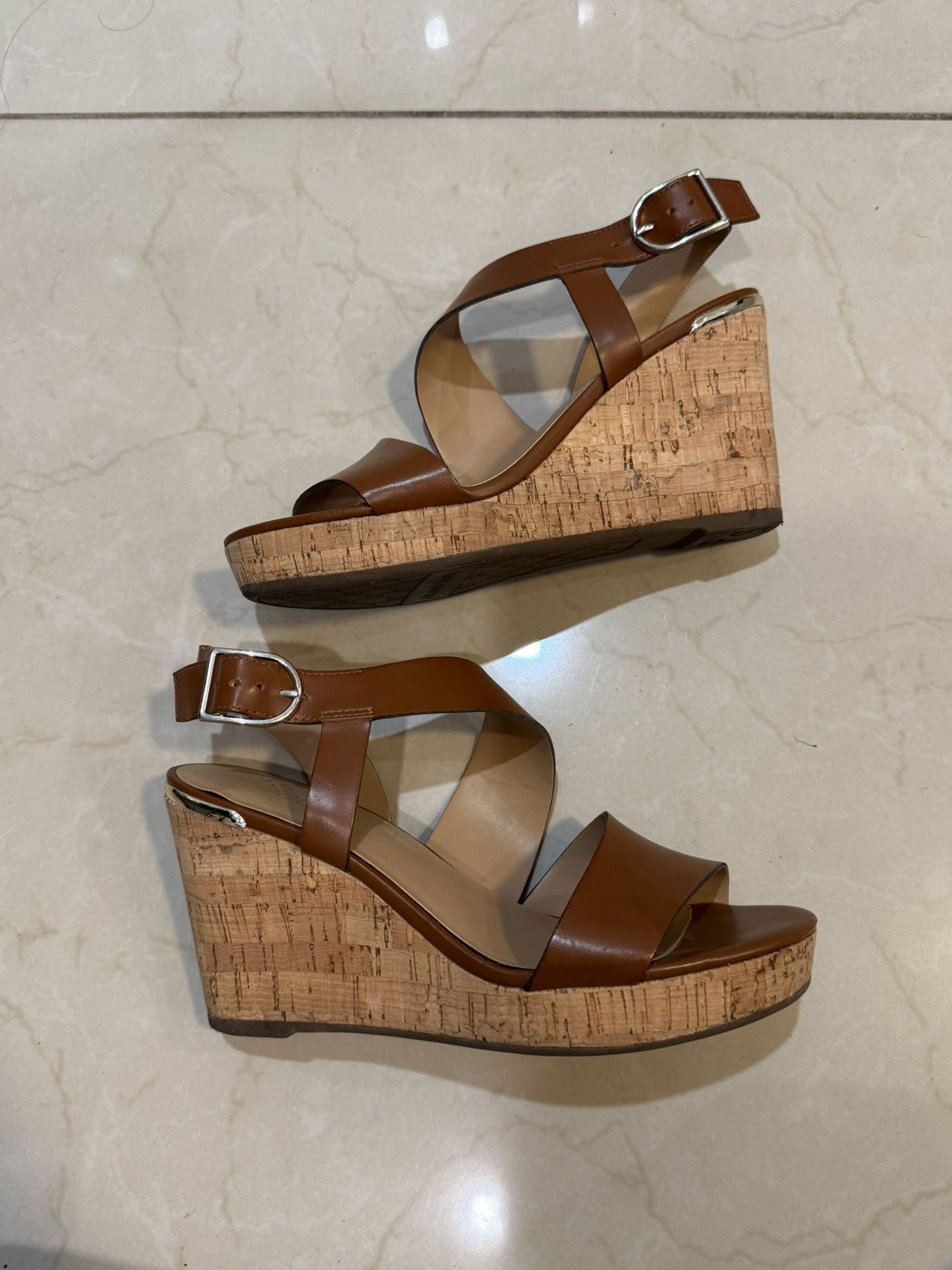 Franco Sarto Marabel wedge sandals with a brown leather upper and cork platform. - this pair is so versatile 😍! She’s giving chic, old money, glitz & glam, casual & summer vibes! - barely used, basically ALMOST new without tags - she was my favs for a while