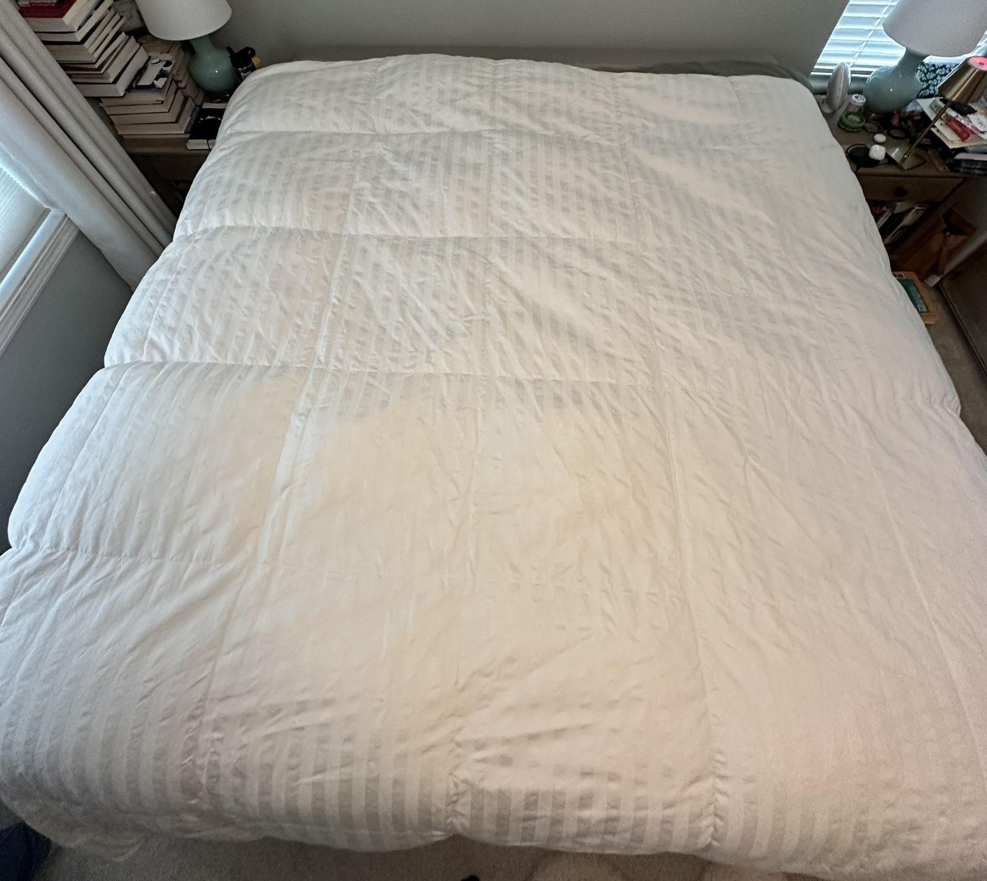 King size good down duvet. Medium weight. Machine washable. No tears or stains. Only used part of the year. Like new condition