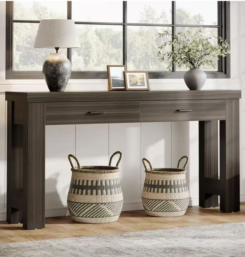 HL0278 63" Console Table with 2 Drawers, Farmhouse Wood Entryway Table with H-Shaped Sturdy Legs for Hallway, Living Room, Dark Gray