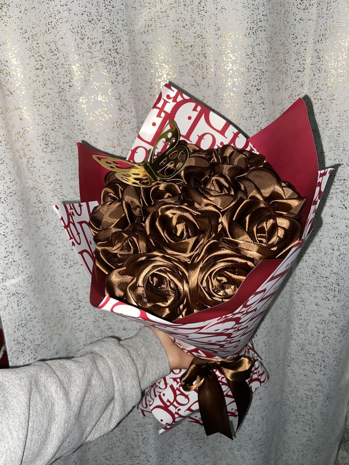 12 brown roses with red dior wrapping paper, ready for pick up/delivery.