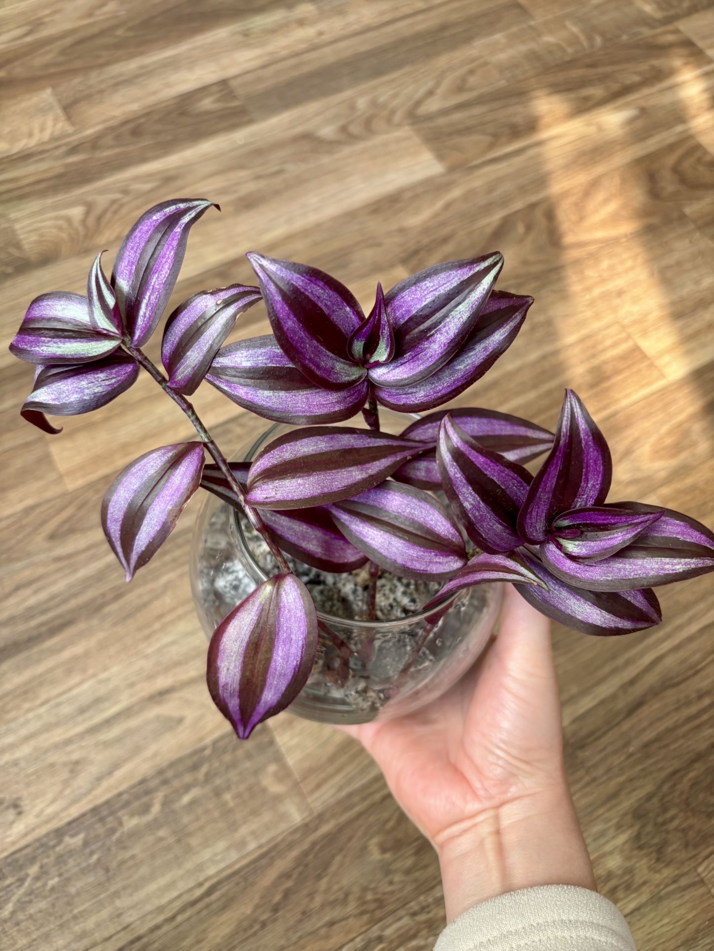 Gorgeous purple wandering plant with stunning metallic stripes. Placed in a clear glass bowl with decorative stones — simple, elegant, and romantic. ✨ Low maintenance ✨ Great for desk, shelf, or gift ✨ Adds instant color and calm to any space