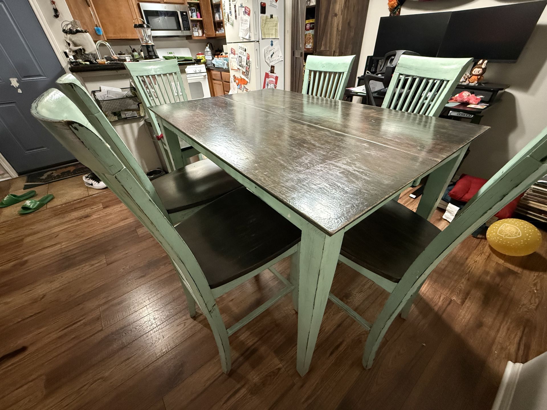 W 54in x 36in Height 36 in Soft sage tone color Good sturdy table with 6 chairs and leaf (expanding table ) Has a farmhouse vintage look with distressing finish