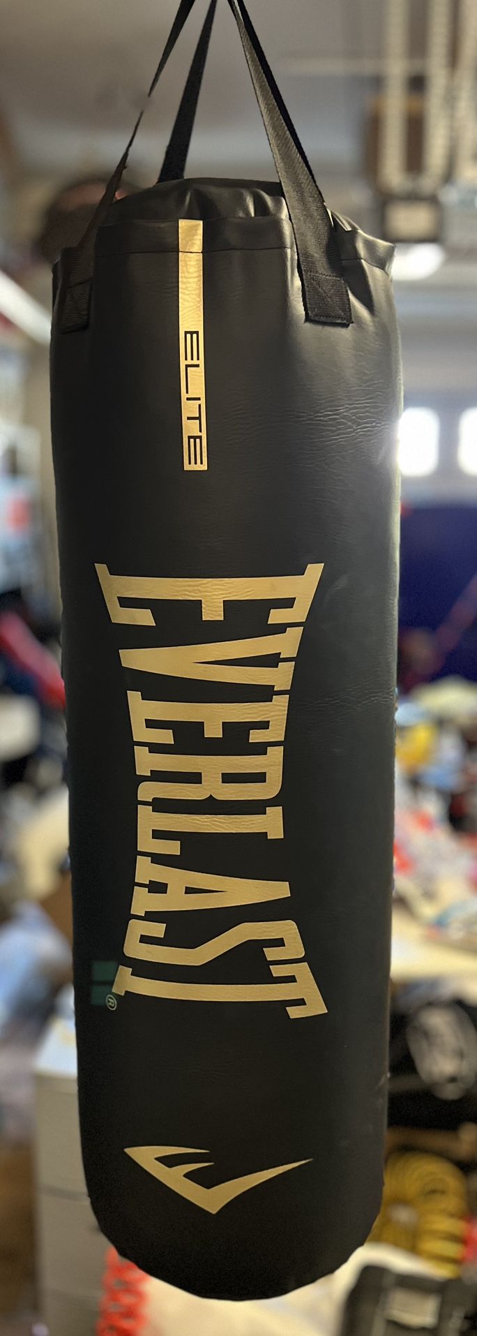 High-quality Everlast Elite punching bag for training. Installed and never used. New condition. 70 lb Everlasting Elite punch bag, hanger bracket, chain, gloves, and wrist wraps (wraps not pictured). Cost over $200.