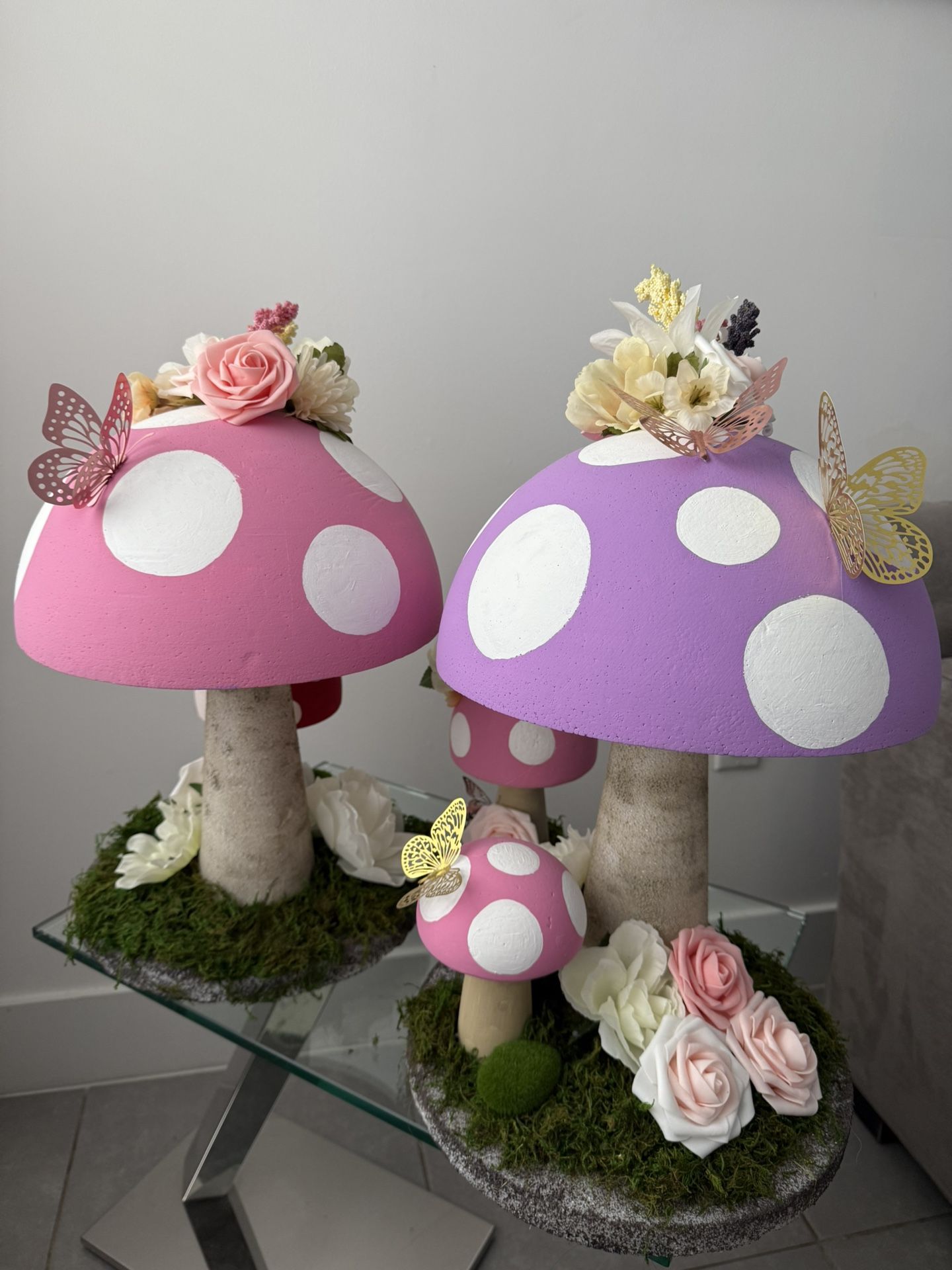 These are hand crafted mushroom decorations for a Tinker Bell Theme birthday party. They are light weight (foam material)